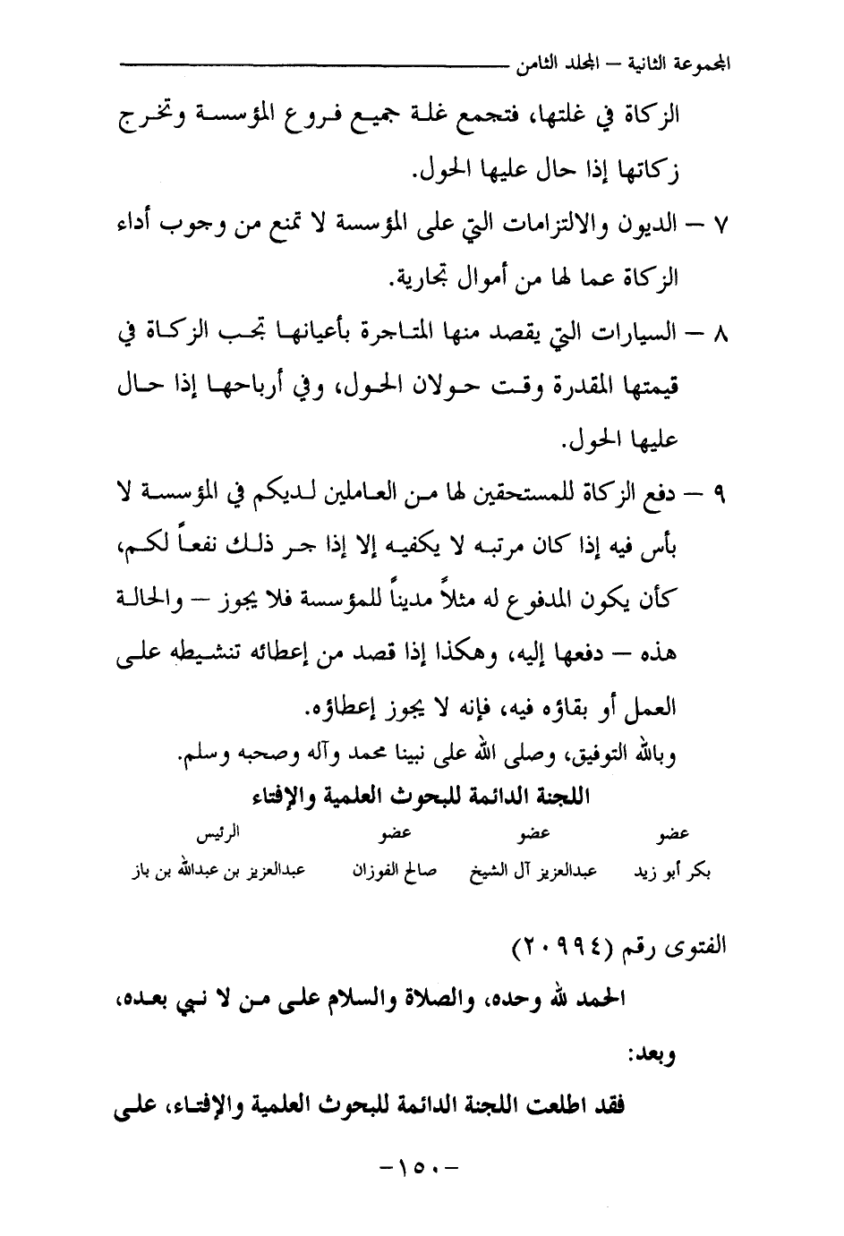 8- السيارات التي يقصد منها المتاجرة بأعيانها تجب الزكاة في قيمتها المقدرة وقت حولان الحول، وفي أرباحها إذا حال عليها الحول.