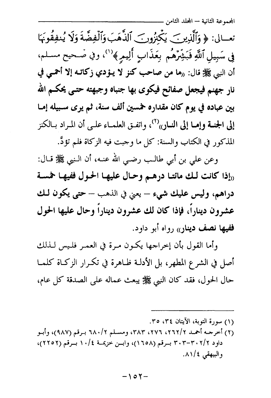 وعن علي بن أبي طالب رضي الله عنه، أن النبي صلى الله عليه وسلم قال: «إذا كانت لك مائتا درهم وحال عليها الحول ففيها خمسة دراهم، وليس عليك شيء – يعني في الذهب – حتى يكون لك عشرون دينارا، فإذا كان لك عشرون دينارا وحال عليها الحول ففيها نصف دينار (¬3) » رواه أبو داود.