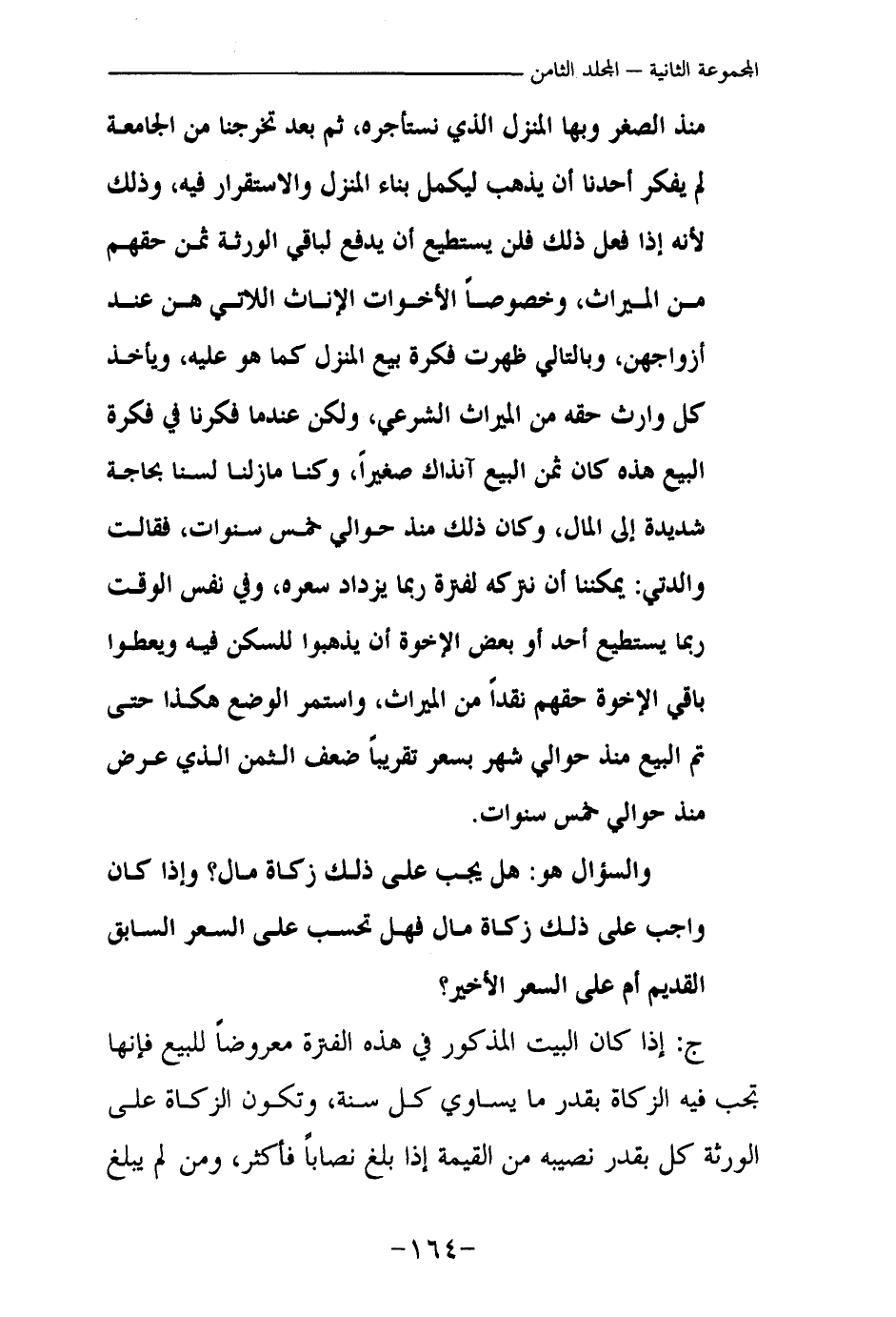 ج: إذا كان البيت المذكور في هذه الفترة معروضا للبيع فإنها تجب فيه الزكاة بقدر ما يساوي كل سنة، وتكون الزكاة على الورثة كل بقدر نصيبه من القيمة إذا بلغ نصابا فأكثر، ومن لم يبلغ