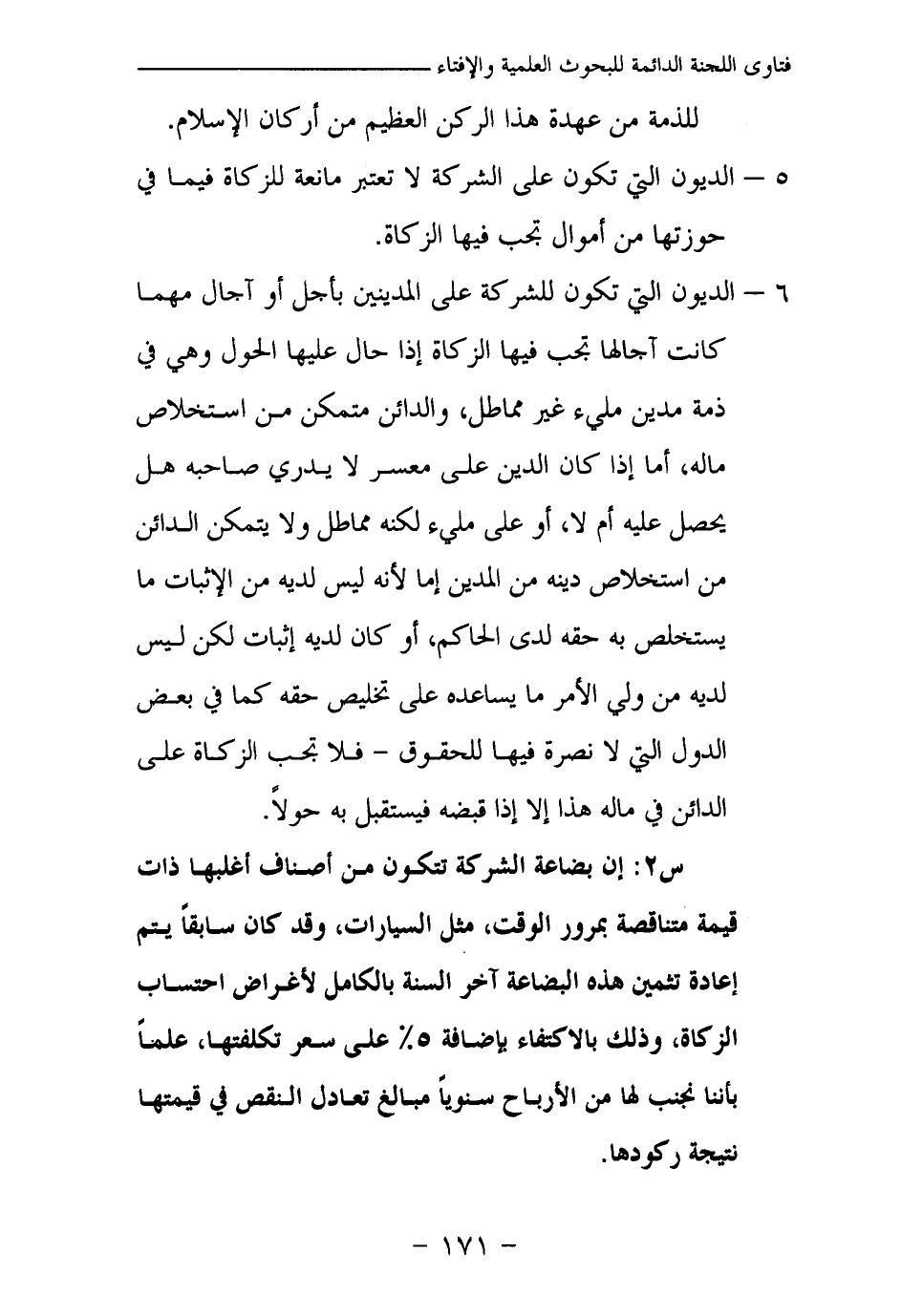 5- الديون التي تكون على الشركة لا تعتبر مانعة للزكاة فيما في حوزتها من أموال تجب فيها الزكاة.