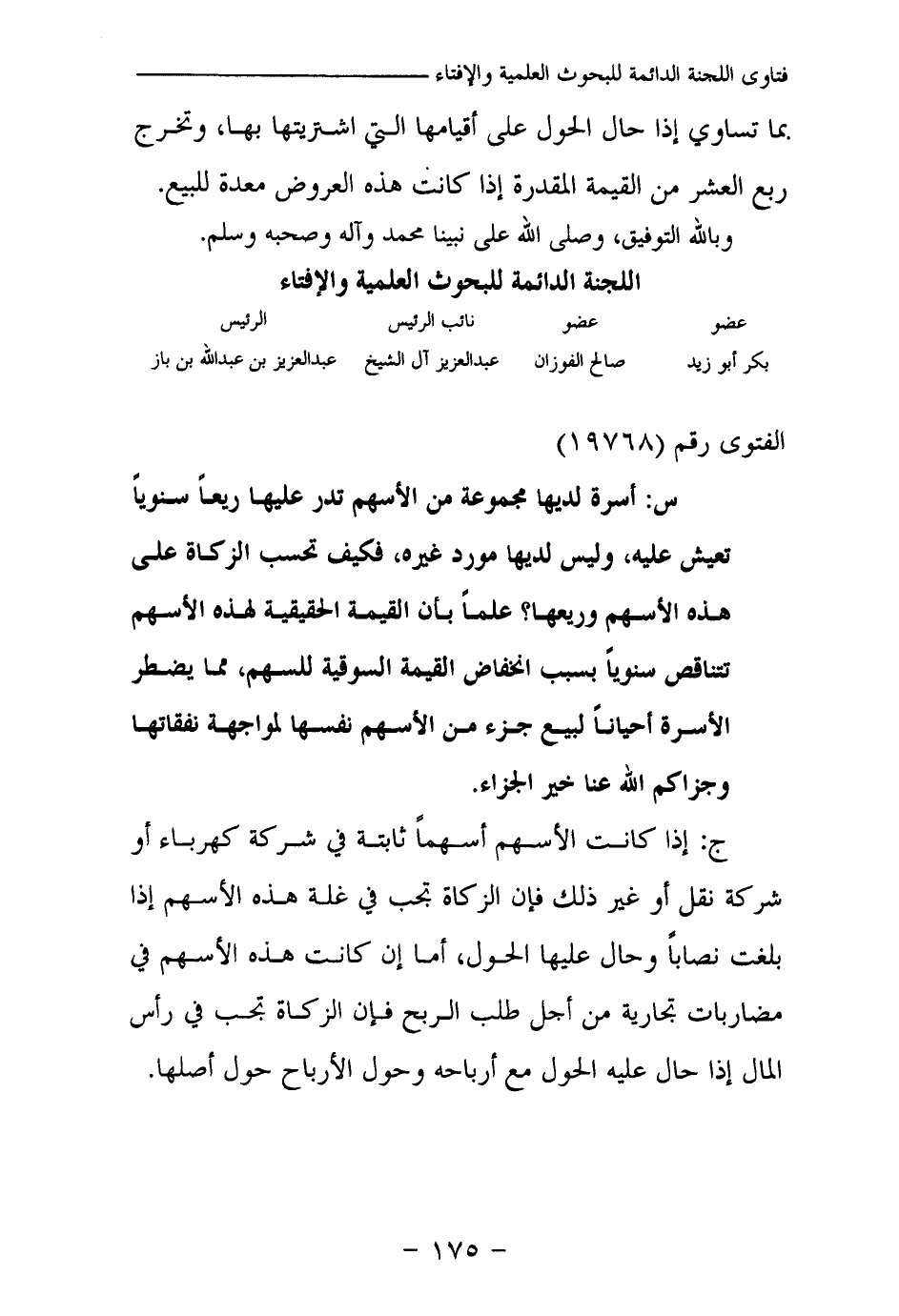 ج: إذا كانت الأسهم أسهما ثابتة في شركة كهرباء أو شركة نقل أو غير ذلك فإن الزكاة تجب في غلة هذه الأسهم إذا بلغت نصابا وحال عليها الحول، أما إن كانت هذه الأسهم في مضاربات تجارية من أجل طلب الربح فإن الزكاة تجب في رأس المال إذا حال عليه الحول مع أرباحه وحول الأرباح حول أصلها.