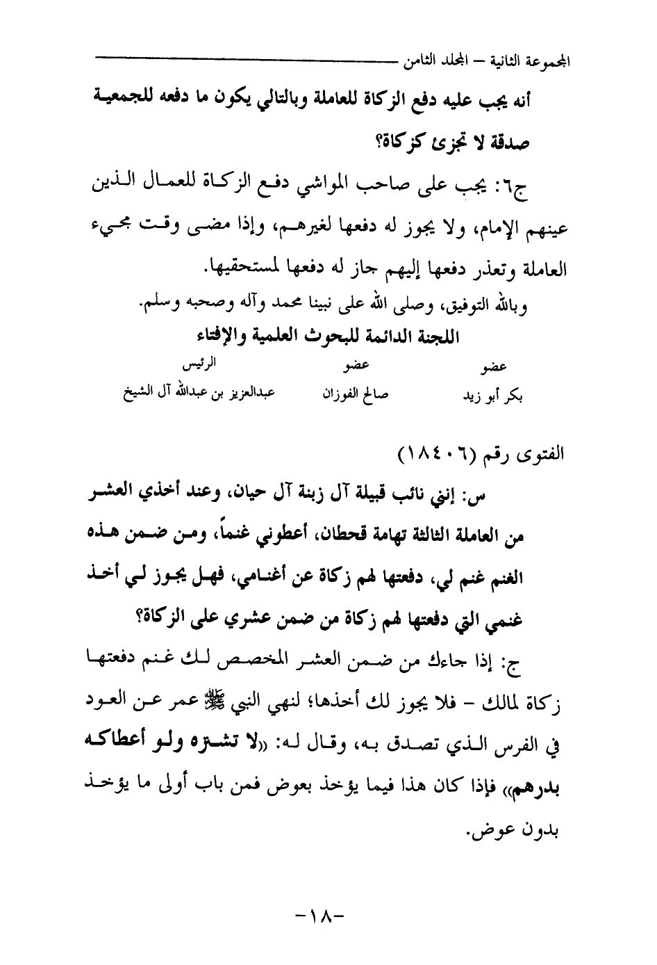 ج: إذا جاءك من ضمن العشر المخصص لك غنم دفعتها زكاة لمالك – فلا يجوز لك أخذها؛ لنهي النبي صلى الله عليه وسلم عمر عن العود في الفرس الذي تصدق به، وقال له: «لا تشتره ولو أعطاكه بدرهم (¬1) » فإذا كان هذا فيما يؤخذ بعوض فمن باب أولى ما يؤخذ بدون عوض.