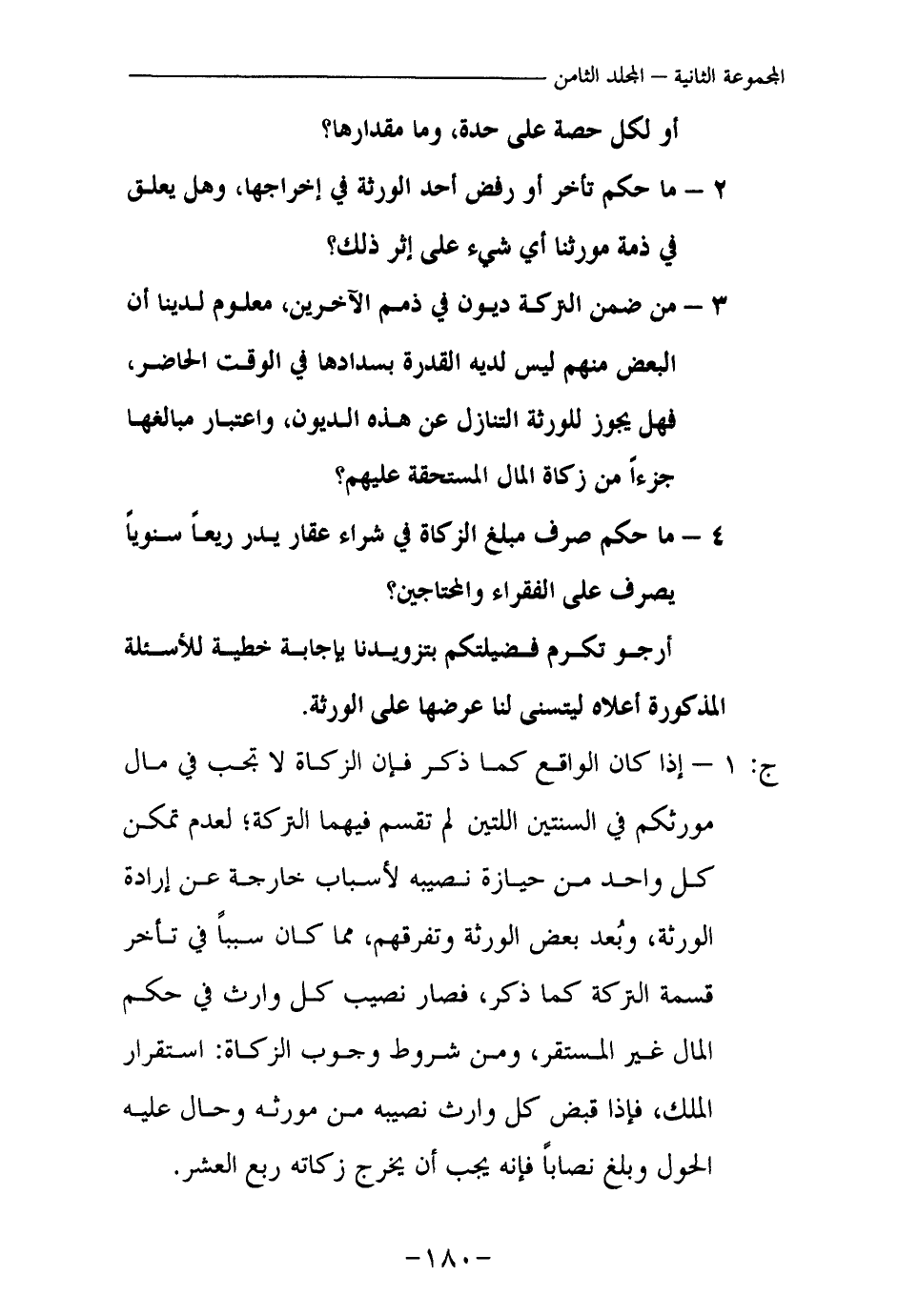 ج: 1 - إذا كان الواقع كما ذكر فإن الزكاة لا تجب في مال مورثكم في السنتين اللتين لم تقسم فيهما التركة؛ لعدم تمكن كل واحد من حيازة نصيبه لأسباب خارجة عن إرادة الورثة، وبعد بعض الورثة وتفرقهم، مما كان سببا في تأخر قسمة التركة كما ذكر، فصار نصيب كل وارث في حكم المال غير المستقر، ومن شروط وجوب الزكاة: استقرار الملك، فإذا قبض كل وارث نصيبه من مورثه وحال عليه الحول وبلغ نصابا فإنه يجب أن يخرج زكاته ربع العشر.