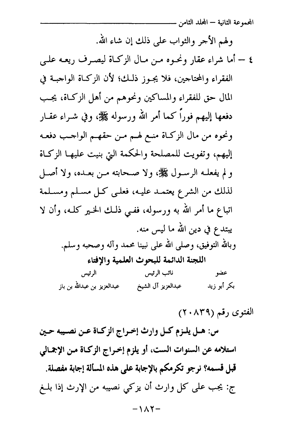 4- أما شراء عقار ونحوه من مال الزكاة ليصرف ريعه على الفقراء والمحتاجين، فلا يجوز ذلك؛ لأن الزكاة الواجبة في المال حق للفقراء والمساكين ونحوهم من أهل الزكاة، يجب دفعها إليهم فورا كما أمر الله ورسوله صلى الله عليه وسلم، وفي شراء عقار ونحوه من مال الزكاة منع لهم من حقهم الواجب دفعه إليهم، وتفويت للمصلحة والحكمة التي بنيت عليها الزكاة ولم يفعله الرسول صلى الله عليه وسلم، ولا صحابته من بعده، ولا أصل لذلك من الشرع يعتمد عليه، فعلى كل مسلم ومسلمة اتباع ما أمر الله به ورسوله، ففي ذلك الخير كله، وأن لا يبتدع في دين الله ما ليس منه.