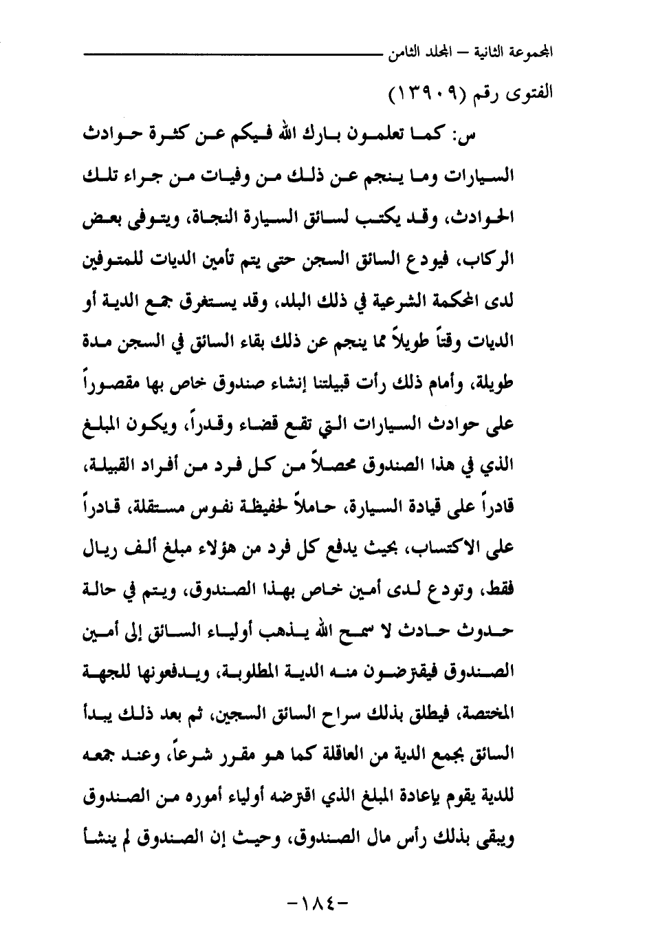 س: كما تعلمون بارك الله فيكم عن كثرة حوادث السيارات وما ينجم عن ذلك من وفيات من جراء تلك الحوادث، وقد يكتب لسائق السيارة النجاة، ويتوفى بعض الركاب، فيودع السائق السجن حتى يتم تأمين الديات للمتوفين لدى المحكمة الشرعية في ذلك البلد، وقد يستغرق جمع الدية أو الديات وقتا طويلا مما ينجم عن ذلك بقاء السائق في السجن مدة طويلة، وأمام ذلك رأت قبيلتنا إنشاء صندوق خاص بها مقصورا على حوادث السيارات التي تقع قضاء وقدرا، ويكون المبلغ الذي في هذا الصندوق محصلا من كل فرد من أفراد القبيلة، قادرا على قيادة السيارة، حاملا لحفيظة نفوس مستقلة، قادرا على الاكتساب، بحيث يدفع كل فرد من هؤلاء مبلغ ألف ريال فقط، وتودع لدى أمين خاص بهذا الصندوق، ويتم في حالة حدوث حادث لا سمح الله يذهب أولياء السائق إلى أمين الصندوق فيقترضون منه الدية المطلوبة، ويدفعونها للجهة المختصة، فيطلق بذلك سراح السائق السجين، ثم بعد ذلك يبدأ السائق بجمع الدية من العاقلة كما هو مقرر شرعا، وعند جمعه للدية يقوم بإعادة المبلغ الذي اقترضه أولياء أموره من الصندوق ويبقى ذلك رأس مال الصندوق، وحيث إن الصندوق لم ينشأ