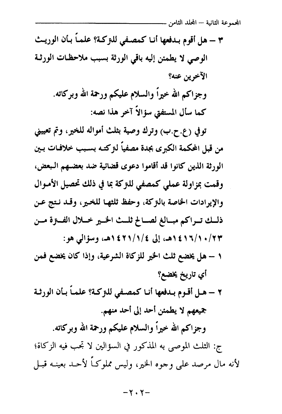 توفي (ع. ح. ب) وترك وصية بثلث أمواله للخير، وتم تعييني من قبل المحكمة الكبرى بجدة مصفيا لتركته بسبب خلافات بين الورثة الذين كانوا قد أقاموا دعوى قضائية ضد بعضهم البعض، وقمت بمزاولة عملي كمصف للتركة بما في ذلك تحصيل الأموال والإيرادات الخاصة بالتركة، وحفظ ثلثها للخير، وقد نتج عن ذلك تراكم مبالغ لصالح ثلث الخير خلال الفترة من 23 / 10 / 1416هـ، إلى 4 / 1 / 1421هـ، وسؤالي هو: