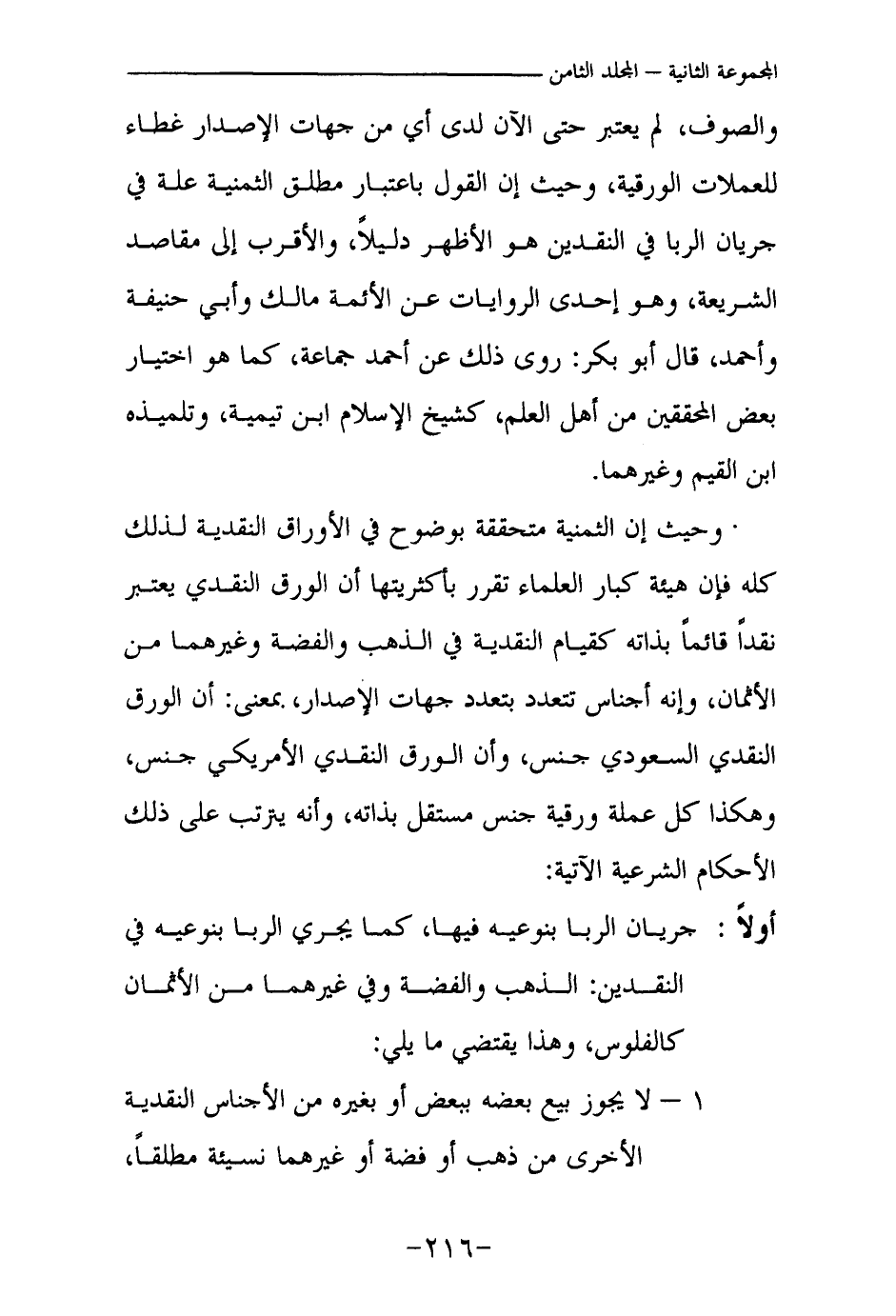 وحيث إن الثمنية متحققة بوضوح في الأوراق النقدية لذلك كله فإن هيئة كبار العلماء تقرر بأكثريتها أن الورق النقدي يعتبر نقدا قائما بذاته كقيام النقدية في الذهب والفضة وغيرهما من الأثمان، وإنه أجناس تتعدد بتعدد جهات الإصدار، بمعنى: أن الورق النقدي السعودي جنس، وأن الورق النقدي الأمريكي جنس، وهكذا كل عملة ورقية جنس مستقل بذاته، وأنه يترتب على ذلك الأحكام الشرعية الآتية: