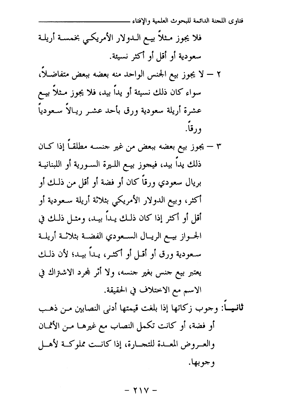 3- يجوز بيع بعضه ببعض من غير جنسه مطلقا إذا كان ذلك يدا بيد، فيجوز بيع الليرة السورية أو اللبنانية بريال سعودي ورقا كان أو فضة أو أقل من ذلك أو أكثر، وبيع الدولار الأمريكي بثلاثة أريلة سعودية أو أقل أو أكثر إذا كان ذلك يدا بيد، ومثل ذلك في الجواز بيع الريال السعودي الفضة بثلاثة أريلة سعودية ورقا أو أقل أو أكثر، يدا بيد؛ لأن ذلك يعتبر بيع جنس بغير جنسه، ولا أثر لمجرد الاشتراك في الاسم مع الاختلاف في الحقيقة.