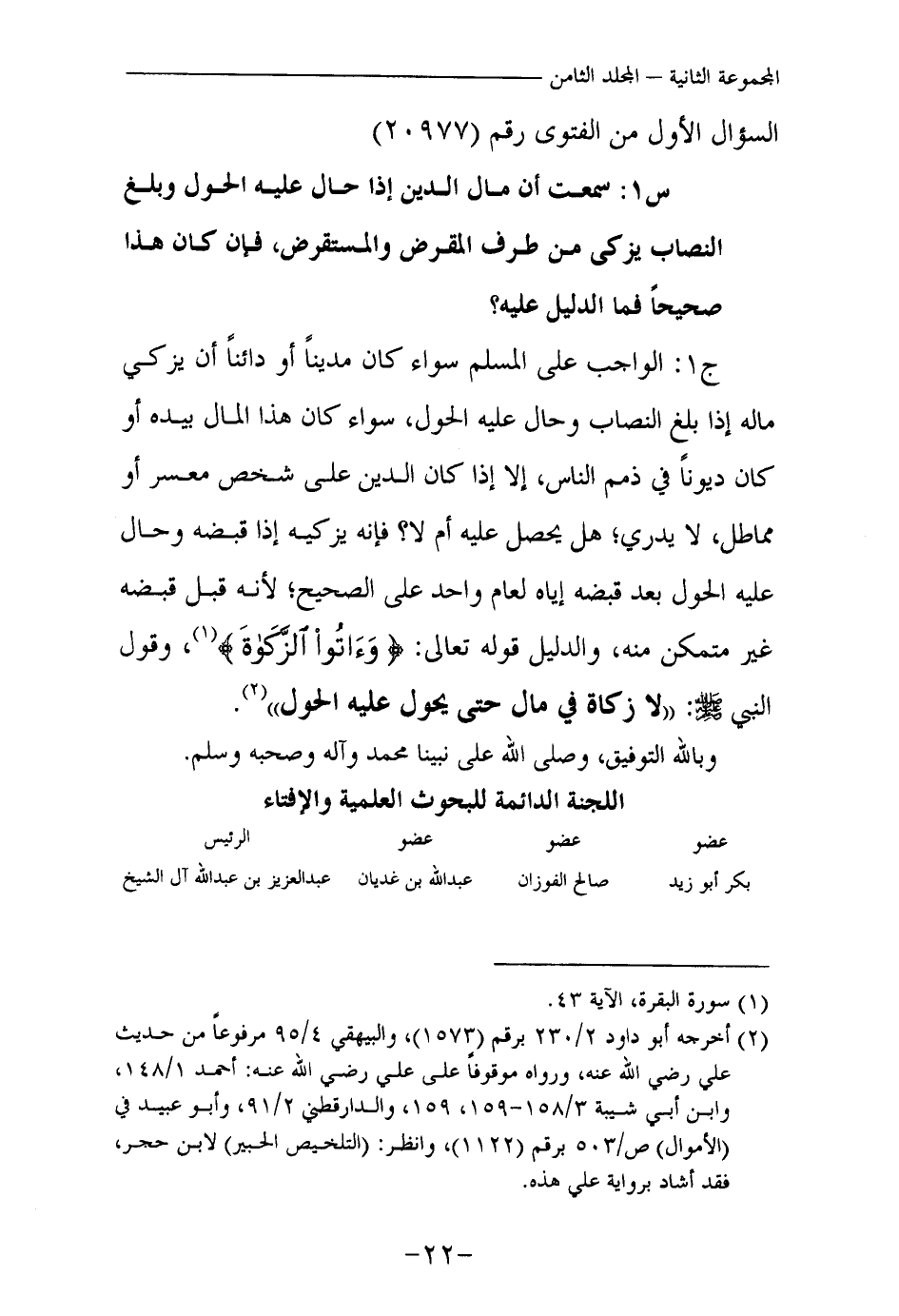 (¬2) أخرجه أبو داود 2\230 برقم (1573) ، والبيهقي 4\95 مرفوعا من حديث علي رضي الله عنه، ورواه موقوفا على علي رضي الله عنه: أحمد 1\148، وابن أبي شيبة 3\158-159، 159 والدارقطني 2\91، وأبو عبيد في (الأموال) ص 503 برقم (1122) ، وانظر: (التلخيص الحبير) لابن حجر، فقد أشاد برواية علي هذه.