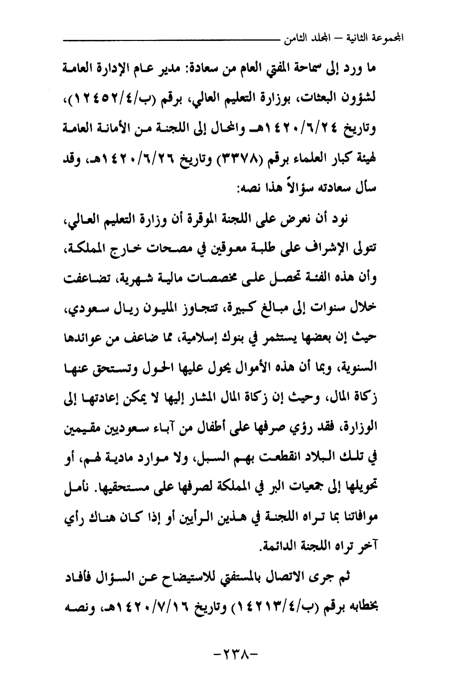 نود أن نعرض على اللجنة الموقرة أن وزارة التعليم العالي، تتولى الإشراف على طلبة معوقين في مصحات خارج المملكة، وأن هذه الفئة تحصل على مخصصات مالية شهرية، تضاعفت خلال سنوات إلى مبالغ كبيرة، تتجاوز المليون ريال سعودي، حيث إن بعضها يستثمر في بنوك إسلامية، مما ضاعف من عوائدها السنوية، وبما أن هذه الأموال يحول عليها الحول وتستحق عنها زكاة المال، وحيث إن زكاة المال المشار إليها لا يمكن إعادتها إلى الوزارة، فقد رئي صرفها على أطفال من آباء سعوديين مقيمين في تلك البلاد انقطعت بهم السبل، ولا موارد مادية لهم، أو تحويلها إلى جمعيات البر في المملكة لصرفها على مستحقيها. نأمل موافاتنا بما تراه اللجنة في هذين الرأيين أو إذا كان هناك رأي آخر تراه اللجنة الدائمة.