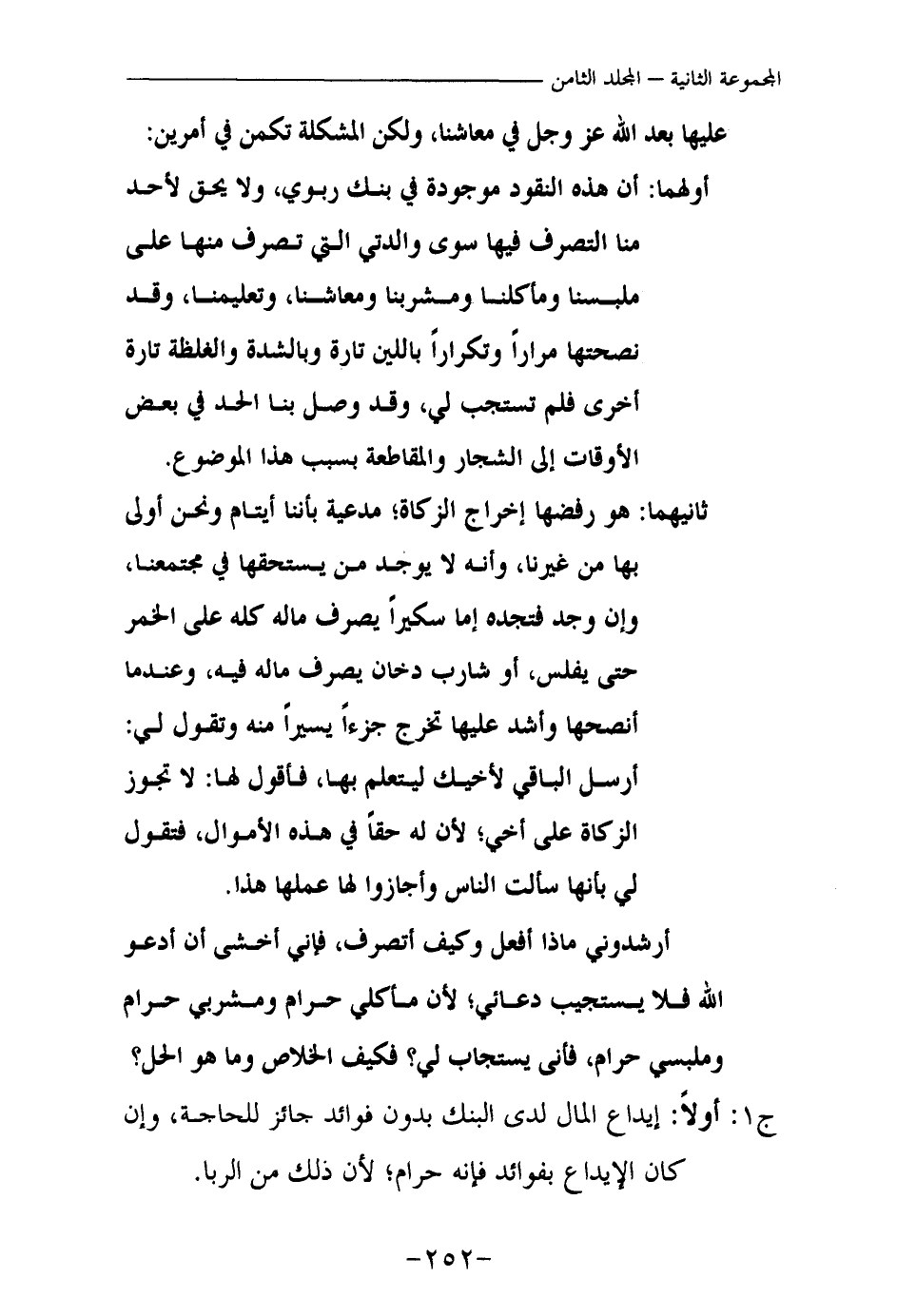أولهما: أن هذه النقود موجودة في بنك ربوي، ولا يحق لأحد منا التصرف فيها سوى والدتي التي تصرف منها على ملبسنا ومأكلنا ومشربنا ومعاشنا، وتعليمنا، وقد نصحتها مرارا وتكرارا باللين تارة وبالشدة والغلظة تارة أخرى فلم تستجب لي، وقد وصل بنا الحد في بعض الأوقات إلى الشجار والمقاطعة بسبب هذا الموضوع.