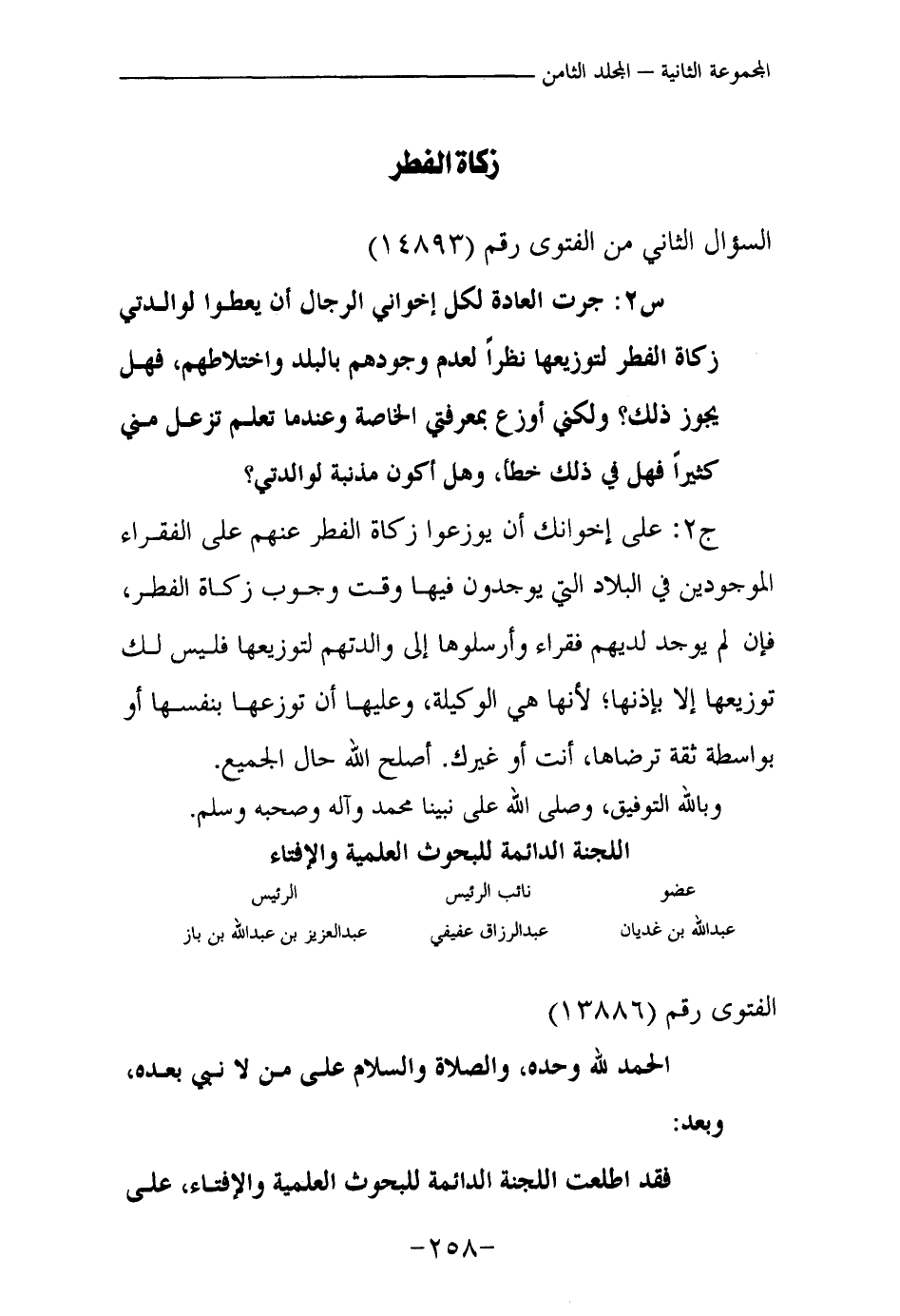 ج2: على إخوانك أن يوزعوا زكاة الفطر عنهم على الفقراء الموجودين في البلاد التي يوجدون فيها وقت وجوب زكاة الفطر، فإن لم يوجد لديهم فقراء وأرسلوها إلى والدتهم لتوزيعها فليس لك توزيعها إلا بإذنها؛ لأنها هي الوكيلة، وعليها أن توزعها بنفسها أو بواسطة ثقة ترضاها، أنت أو غيرك. أصلح الله حال الجميع.