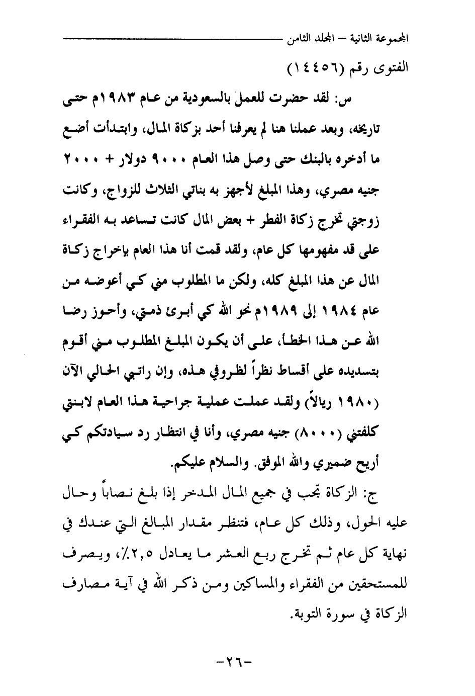 س: لقد حضرت للعمل بالسعودية من عام 1983م حتى تاريخه، وبعد عملنا هنا لم يعرفنا أحد بزكاة المال، وابتدأت أضع ما أدخره بالبنك حتى وصل هذا العام 9000 دولار 2000 جنيه مصري، وهذا المبلغ لأجهز به بناتي الثلاث للزواج، وكانت زوجتي تخرج زكاة الفطر بعض المال كانت تساعد به الفقراء على قد مفهومها كل عام، ولقد قمت أنا هذا العام بإخراج زكاة المال عن هذا المبلغ كله، ولكن ما المطلوب مني كي أعوضه من عام 1984 إلى 1989 م نحو الله كي أبرئ ذمتي، وأحوز رضا الله عن هذا الخطأ، على أن يكون المبلغ المطلوب مني أقوم بتسديده على أقساط نظرا لظروفي هذه، وإن راتبي الحالي الآن (1980 ريالا) ولقد عملت عملية جراحية هذا العام لابنتي كلفتني (8000) جنيه مصري، وأنا في انتظار رد سيادتكم كي أريح ضميري والله الموفق. والسلام عليكم.