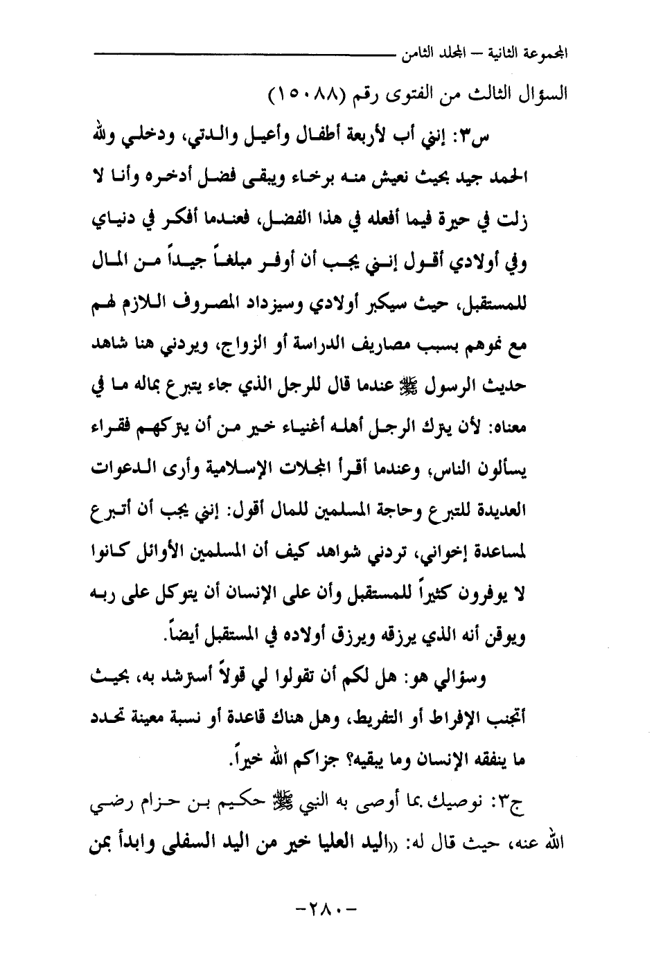 س3: إنني أب لأربعة أطفال وأعيل والدتي، ودخلي ولله الحمد جيد بحيث نعيش منه برخاء ويبقى فضل أدخره وأنا لا زلت في حيرة فيما أفعله في هذا الفضل، فعندما أفكر في دنياي وفي أولادي أقول إنني يجب أن أوفر مبلغا جيدا من المال للمستقبل، حيث سيكبر أولادي وسيزداد المصروف اللازم لهم مع نموهم بسبب مصاريف الدراسة أو الزواج، ويردني هنا شاهد حديث الرسول صلى الله عليه وسلم عندما قال للرجل الذي جاء يتبرع بماله ما في معناه: لأن يترك الرجل أهله أغنياء خير من أن يتركهم فقراء يسألون الناس، وعندما أقرأ المجلات الإسلامية وأرى الدعوات العديدة للتبرع وحاجة المسلمين للمال أقول: إنني يجب أن أتبرع لمساعدة إخواني، تردني شواهد كيف أن المسلمين الأوائل كانوا لا يوفرون كثيرا للمستقبل وأن على الإنسان أن يتوكل على ربه ويوقن أنه الذي يرزقه ويرزق أولاده في المستقبل أيضا.