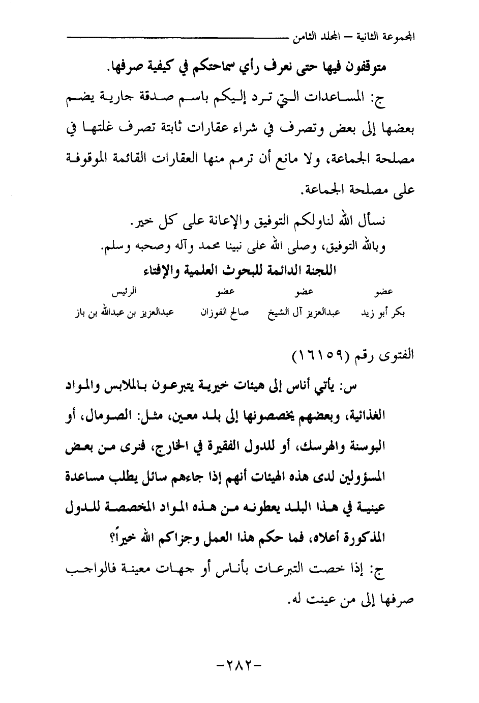 ج: المساعدات التي ترد إليكم باسم " صدقة جارية "؛ يضم بعضها إلى بعض وتصرف في شراء عقارات ثابتة تصرف غلتها في مصلحة الجماعة، ولا مانع أن ترمم منها العقارات القائمة الموقوفة على مصلحة الجماعة.