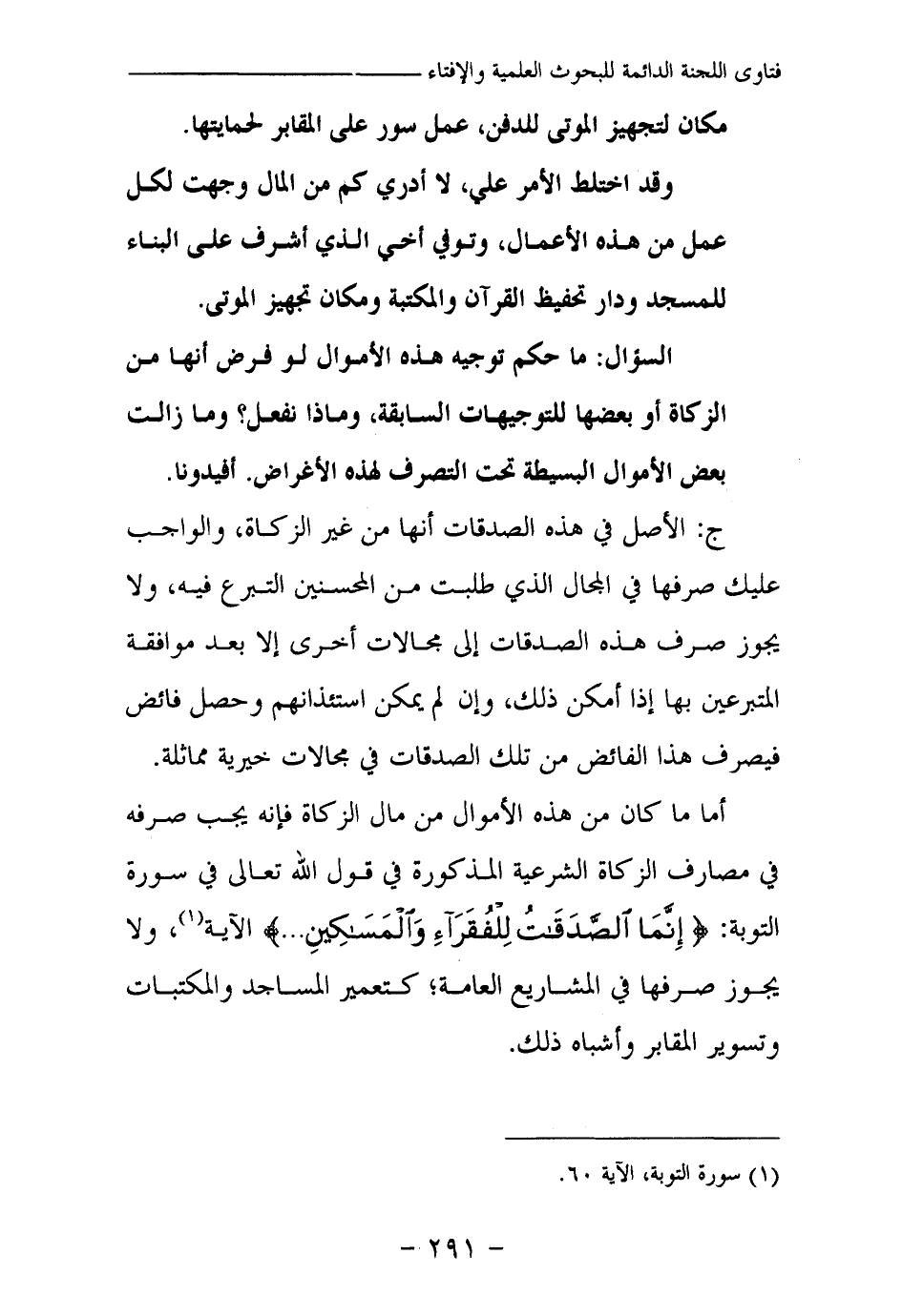 أما ما كان من هذه الأموال من مال الزكاة فإنه يجب صرفه في مصارف الزكاة الشرعية المذكورة في قول الله تعالى في سورة التوبة: {إِنَّمَا الصَّدَقَاتُ لِلْفُقَرَاءِ وَالْمَسَاكِينِ} (¬1) الآية، ولا يجوز صرفها في المشاريع العامة؛ كتعمير المساجد والمكتبات وتسوير المقابر وأشباه ذلك.