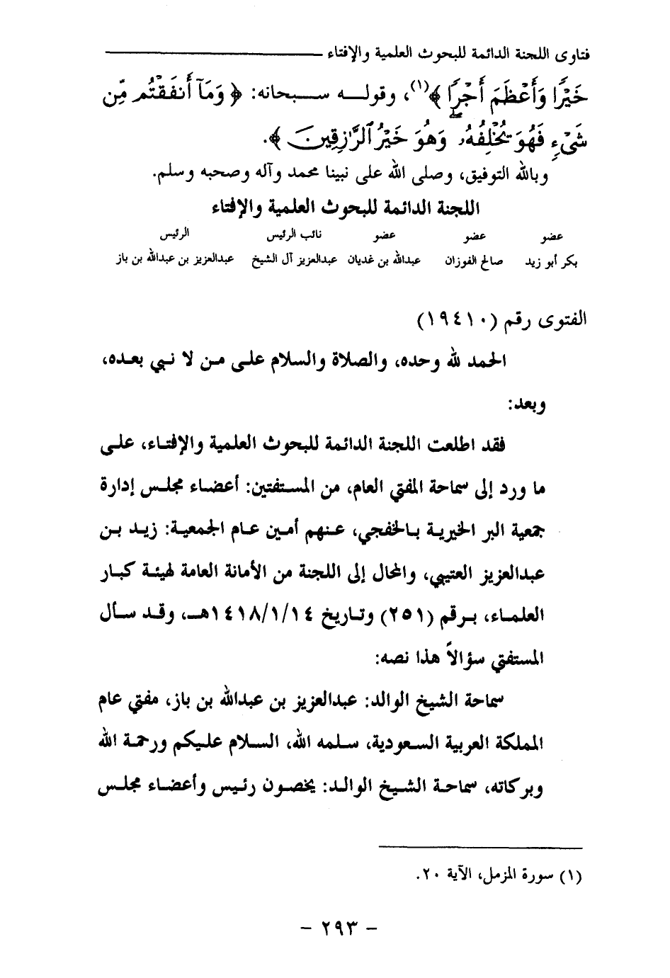 فقد اطلعت اللجنة الدائمة للبحوث العلمية والإفتاء، على ما ورد إلى سماحة المفتي العام من المستفتين: أعضاء مجلس إدارة جمعية البر الخيرية بالخفجي، عنهم أمين عام الجمعية: زيد بن عبد العزيز العتيبي، والمحال إلى اللجنة من الأمانة العامة لهيئة كبار العلماء، برقم (251) وتاريخ 14 / 1 / 1418هـ، وقد سأل المستفتي سؤالا هذا نصه: