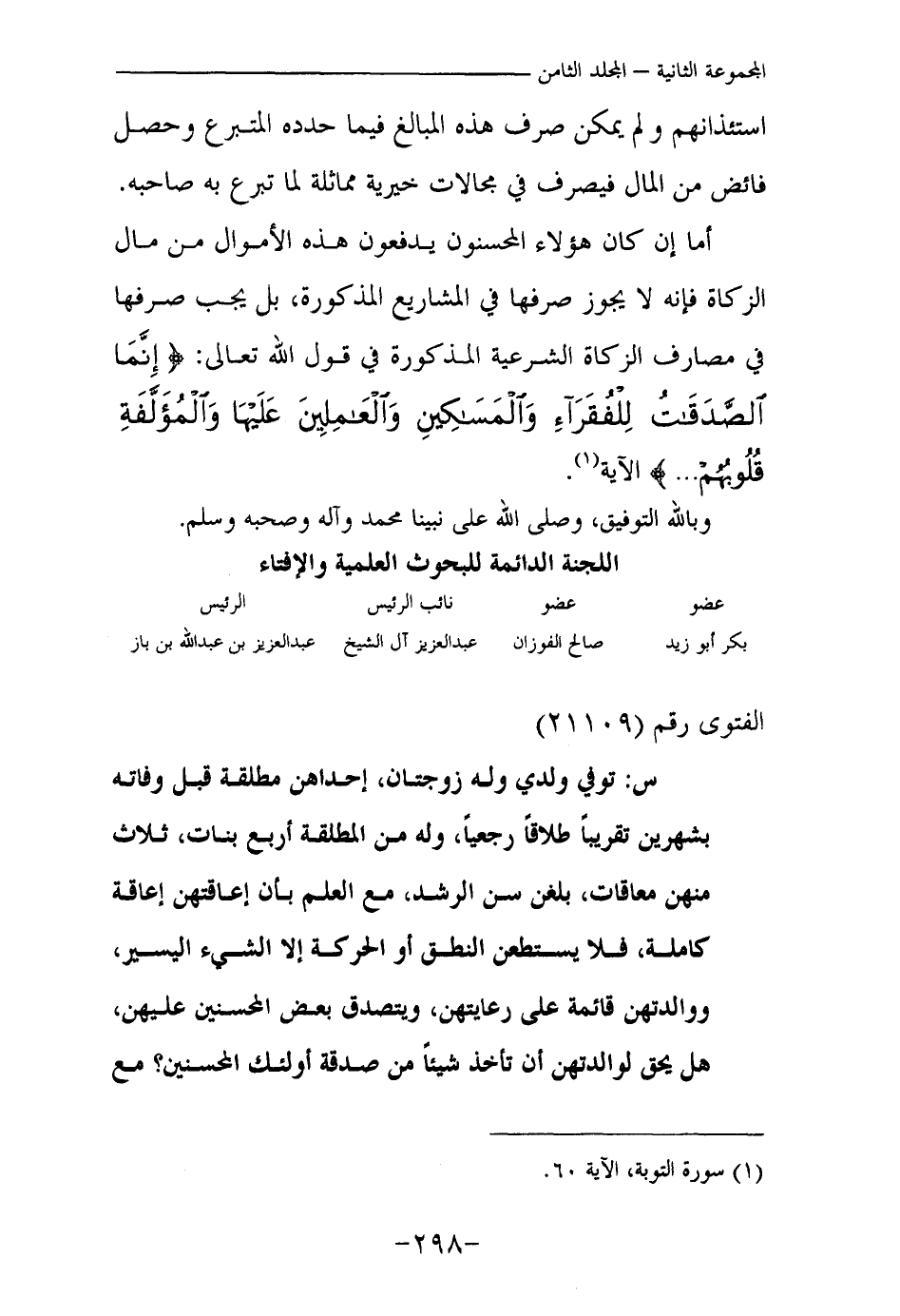 استئذانهم ولم يمكن صرف هذه المبالغ فيما حدده المتبرع وحصل فائض من المال فيصرف في مجالات خيرية مماثلة لما تبرع به صاحبه. أما إن كان هؤلاء المحسنون يدفعون هذه الأموال من مال الزكاة فإنه لا يجوز صرفها في المشاريع المذكورة، بل يجب صرفها في مصارف الزكاة الشرعية المذكورة في قول الله تعالى: {إِنَّمَا الصَّدَقَاتُ لِلْفُقَرَاءِ وَالْمَسَاكِينِ وَالْعَامِلِينَ عَلَيْهَا وَالْمُؤَلَّفَةِ قُلُوبُهُمْ} (¬1) الآية.
