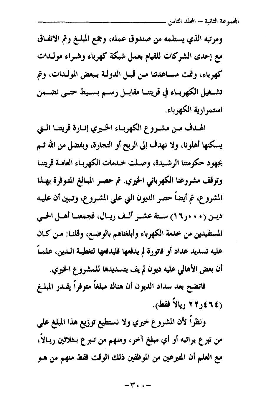 الهدف من مشروع الكهرباء الخيري إنارة قريتنا التي يسكنها أهلونا، ولا نهدف إلى الربح أو التجارة، وبفضل من الله ثم بجهود حكومتنا الرشيدة وصلت خدمات الكهرباء العامة قريتنا وتوقف مشروعنا الكهربائي الخيري. تم حصر المبالغ المتوفرة بهذا المشروع، تم أيضا حصر الديون التي على المشروع، وتبين أن عليه دينا (16.000) ستة عشرة ألف ريال، فجمعنا أهل الحي المستفيدين من خدمة الكهرباء وأبلغناهم بالوضع، وقلنا: من كان عليه تسديد عداد أو فاتورة لم يدفعها فليدفعها لتغطية الدين، علما أن بعض الأهالي عليه ديون لم يف بتسديدها للمشروع الخيري.