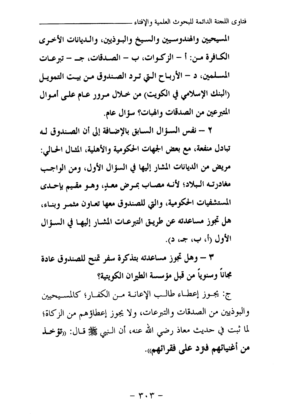 المسيحيين والهندوسيين والسيخ والبوذيين، والديانات الأخرى الكافرة من: أ- الزكوات. ب- الصدقات. جـ- تبرعات المسلمين. د- الأرباح التي ترد الصندوق من بيت التمويل (البنك الإسلامي في الكويت) من خلال مرور عام على أموال المتبرعين من الصدقات والهبات؟ سؤال عام.