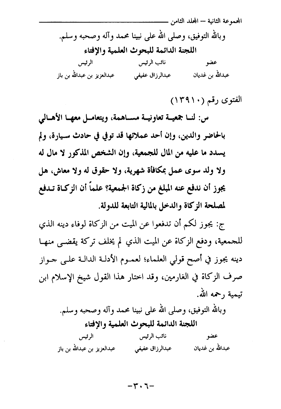 س: لنا جمعية تعاونية مساهمة، ويتعامل معها الأهالي بالحاضر والدين، وإن أحد عملائها قد توفي في حادث سيارة، ولم يسدد ما عليه من المال للجمعية، وإن الشخص المذكور لا مال له ولا ولد سوى عمل بمكافأة شهرية، ولا حقوق له ولا معاش، هل يجوز أن ندفع عنه المبلغ من زكاة الجمعية؟ علما أن الزكاة تدفع لمصلحة الزكاة والدخل بالمالية التابعة للدولة.