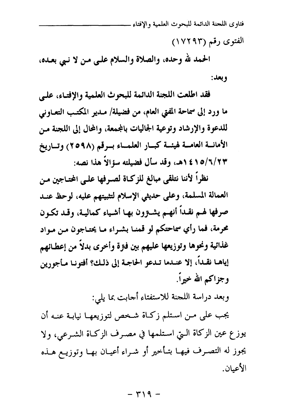 فقد اطلعت اللجنة الدائمة للبحوث العلمية والإفتاء، على ما ورد إلى سماحة المفتي العام، من فضيلة مدير المكتب التعاوني للدعوة والإرشاد وتوعية الجاليات بالمجمعة، والمحال إلى اللجنة من الأمانة العامة لهيئة كبار العلماء برقم (2598) وتاريخ 23 / 6 / 1415هـ، وقد سأل فضيلته سؤالا هذا نصه: