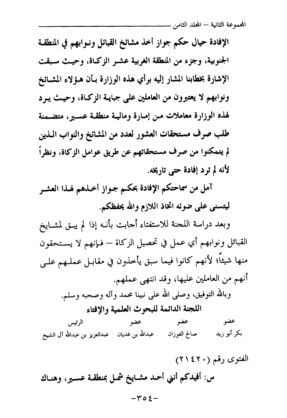 وبعد دراسة اللجنة للاستفتاء أجابت بأنه إذا لم يبق لمشايخ القبائل ونوابهم أي عمل في تحصيل الزكاة – فإنهم لا يستحقون منها شيئا؛ لأنهم كانوا فيما سبق يأخذون في مقابل عملهم على أنهم من العاملين عليها، وقد انتهى عملهم.
