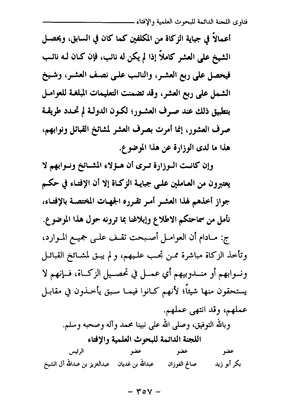 وإن كانت الوزارة ترى أن هؤلاء المشائخ ونوابهم لا يعتبرون من العاملين على جباية الزكاة إلا أن الإفتاء في حكم جواز أخذهم لهذا العشر أمر تقرره الجهات المختصة بالإفتاء، نأمل من سماحتكم الاطلاع وإبلاغنا بما ترونه حول هذا الموضوع.