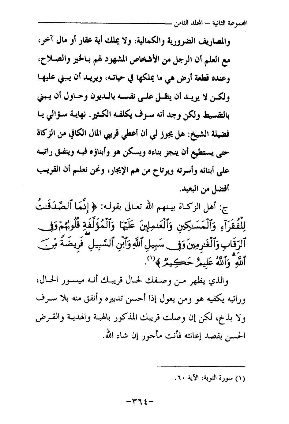 والمصاريف الضرورية والكمالية، ولا يملك أية عقار أو مال آخر، مع العلم أن الرجل من الأشخاص المشهود لهم بالخير والصلاح، وعنده قطعة أرض هي ما يملكها في حياته، ويريد أن يبني عليها ولكن لا يريد أن يثقل على نفسه بالديون وحاول أن يبني بالتقسيط ولكن وجد أنه سوف يكلفه الكثير. نهاية سؤالي يا فضيلة الشيخ: هل يجوز لي أن أعطي قريبي المال الكافي من الزكاة حتى يستطيع أن ينجز بناءه ويسكن هو وأبناؤه فيه وينفق راتبه على أبنائه وأسرته ويرتاح من هم الإيجار، ونحن نعلم أن القريب أفضل من البعيد.
