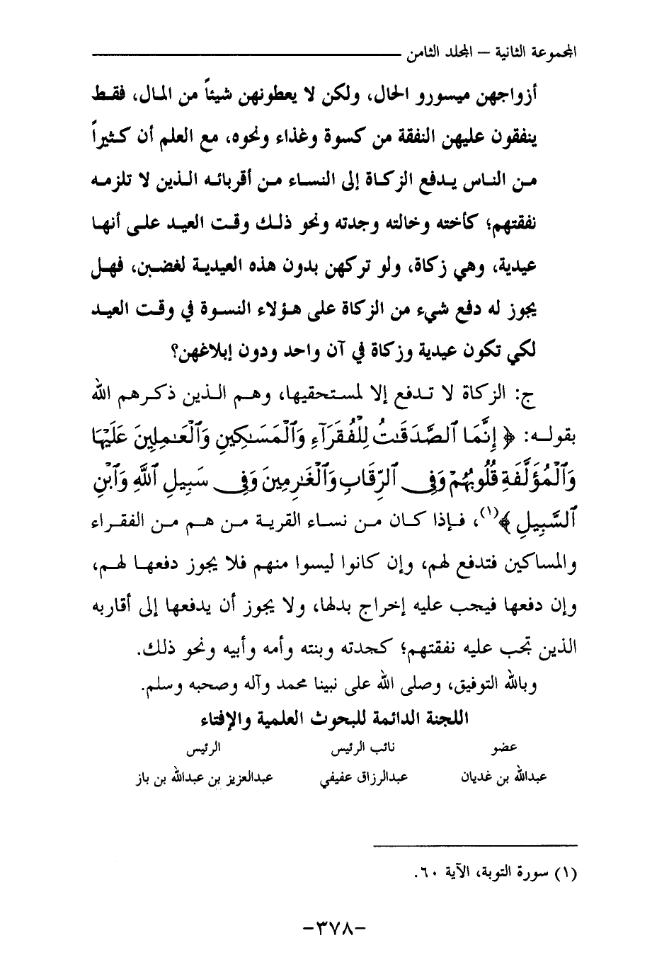 ج: الزكاة لا تدفع إلا لمستحقيها، وهم الذين ذكرهم الله بقوله: {إِنَّمَا الصَّدَقَاتُ لِلْفُقَرَاءِ وَالْمَسَاكِينِ وَالْعَامِلِينَ عَلَيْهَا وَالْمُؤَلَّفَةِ قُلُوبُهُمْ وَفِي الرِّقَابِ وَالْغَارِمِينَ وَفِي سَبِيلِ اللَّهِ وَاِبْنِ السَّبِيلِ} (¬1) فإذا كان من نساء القرية من هم من الفقراء والمساكين فتدفع لهم، وإن كانوا ليسوا منهم فلا يجوز دفعها لهم، وإن دفعها فيجب عليه إخراج بدلها، ولا يجوز أن يدفعها إلى أقاربه الذين تجب عليه نفقتهم؛ كجدته وبنته وأمه وأبيه ونحو ذلك.