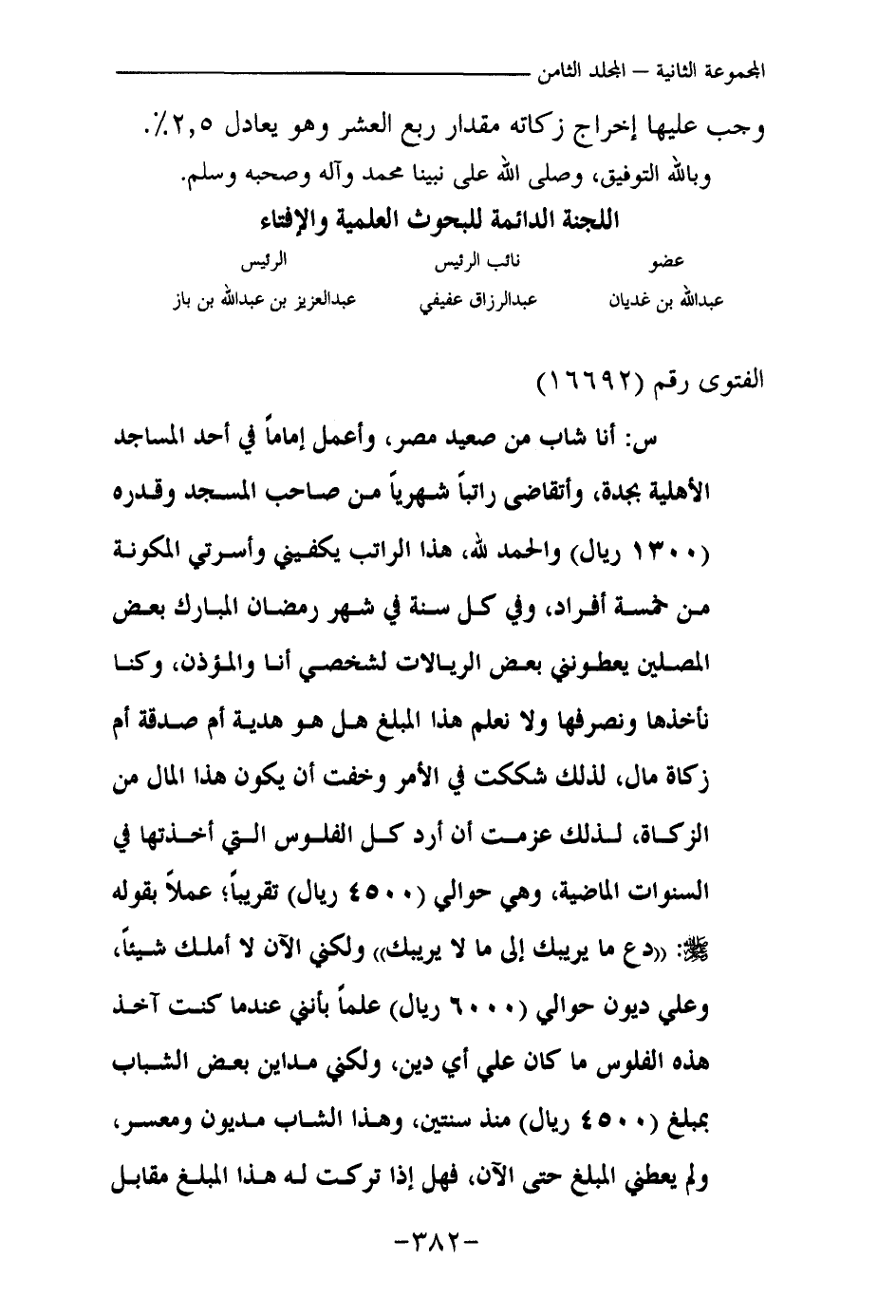 س: أنا شاب من صعيد مصر، وأعمل إماما في أحد المساجد الأهلية بجدة، وأتقاضى راتبا شهريا من صاحب المسجد وقدره (1300 ريال) والحمد لله، هذا الراتب يكفيني وأسرتي المكونة من خمسة أفراد، وفي كل سنة في شهر رمضان المبارك بعض المصلين يعطونني بعض الريالات لشخصي أنا والمؤذن، وكنا نأخذها ونصرفها ولا نعلم هذا المبلغ هل هو هدية أم صدقة أم زكاة مال، لذلك شككت في الأمر وخفت أن يكون هذا المال من الزكاة، لذلك عزمت أن أرد كل الفلوس التي أخذتها في السنوات الماضية، وهي حوالي (4500 ريال) تقريبا؛ عملا بقوله صلى الله عليه وسلم: «دع ما يريبك إلى ما لا يريبك (¬1) » ولكني الآن لا أملك شيئا، وعلي ديون حوالي (6000 ريال) علما بأنني عندما كنت آخذ هذه الفلوس ما كان علي أي دين، ولكني مداين بعض الشباب بملبغ (4500 ريال) منذ سنتين، وهذا الشاب مديون ومعسر، ولم يعطني المبلغ حتى الآن، فهل إذا تركت له هذا المبلغ مقابل