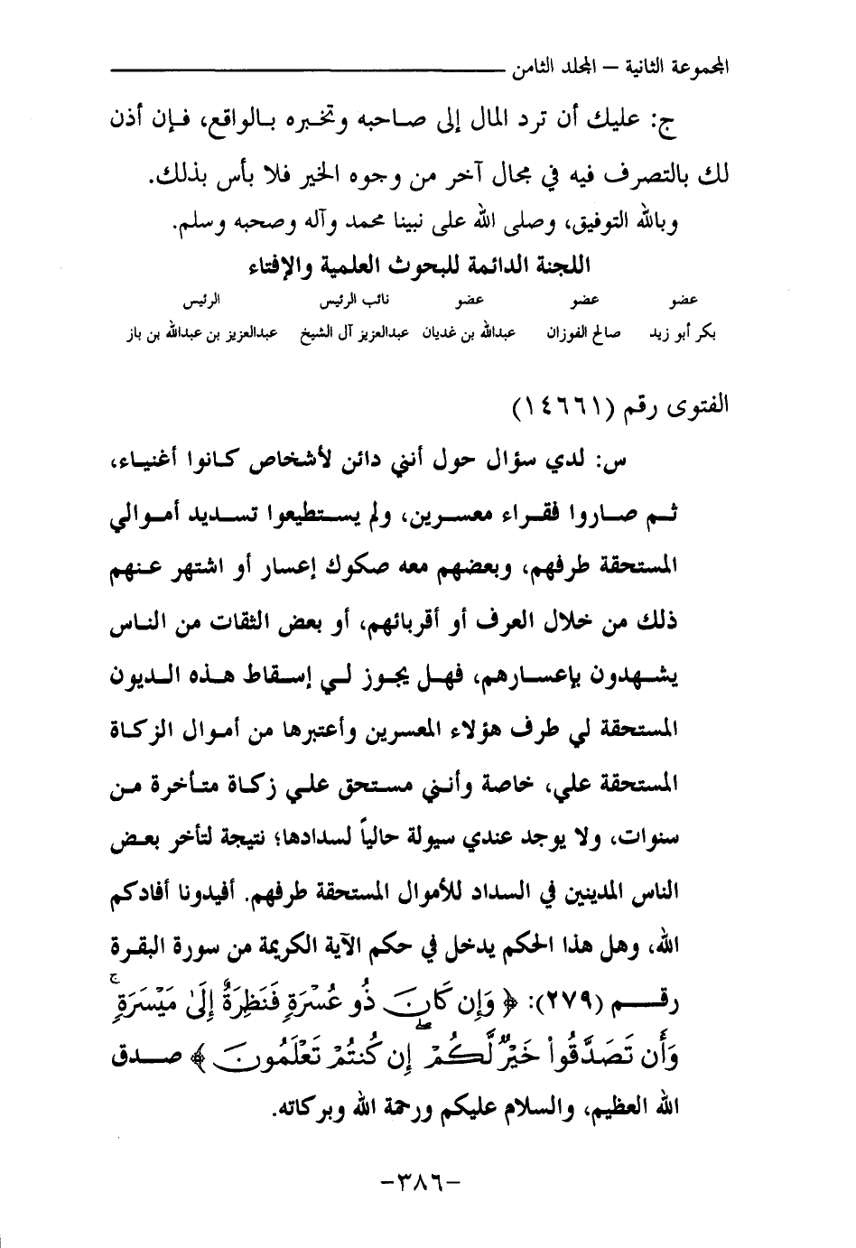 س: لدي سؤال حول أنني دائن لأشخاص كانوا أغنياء، ثم صاروا فقراء معسرين، ولم يستطيعوا تسديد أموالي المستحقة طرفهم، وبعضهم معه صكوك إعسار أو اشتهر عنهم ذلك من خلال العرف أو أقربائهم، أو بعض الثقات من الناس يشهدون بإعسارهم، فهل يجوز لي إسقاط هذه الديون المستحقة لي طرف هؤلاء المعسرين وأعتبرها من أموال الزكاة المستحقة علي، خاصة وأنني مستحق علي زكاة متأخرة من سنوات، ولا يوجد عندي سيولة حاليا لسدادها؛ نتيجة لتأخر بعض الناس المدينين في السداد للأموال المستحقة طرفهم. أفيدونا أفادكم الله، وهل هذا الحكم يدخل في حكم الآية الكريمة من سورة البقرة رقم (279) : {وَإِنْ كَانَ ذُو عُسْرَةٍ فَنَظِرَةٌ إِلَى مَيْسَرَةٍ وَأَنْ تَصَدَّقُوا خَيْرٌ لَكُمْ إِنْ كُنْتُمْ تَعْلَمُونَ} (¬1) صدق الله العظيم، والسلام عليكم ورحمة الله وبركاته.
