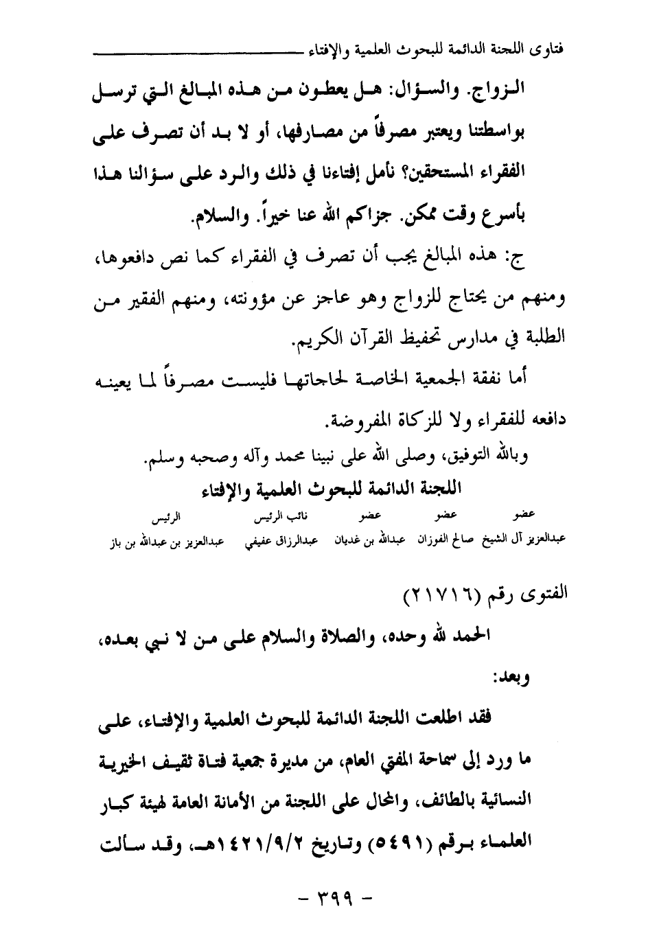 فقد اطلعت اللجنة الدائمة للبحوث العلمية والإفتاء، على ما ورد إلى سماحة المفتي العام، من مديرة جمعية فتاة ثقيف الخيرية النسائية بالطائف، والمحال على اللجنة من الأمانة العامة لهيئة كبار العلماء برقم (5491) وتاريخ 2 / 9 / 1421هـ، وقد سألت