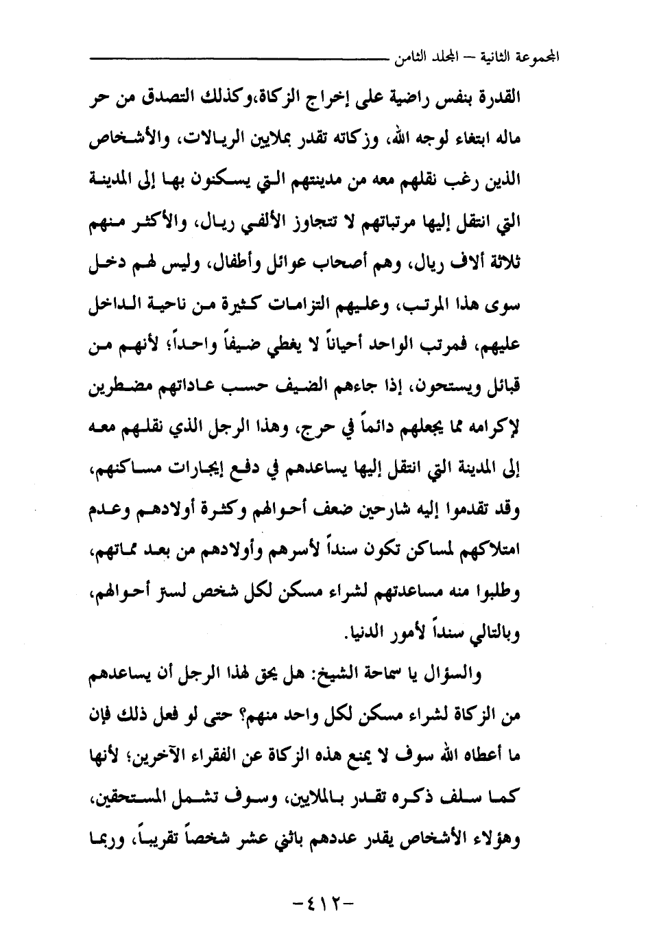 القدرة بنفس راضية على إخراج الزكاة، وكذلك التصدق من حر ماله ابتغاء لوجه الله، وزكاته تقدر بملايين الريالات، والأشخاص الذين رغب نقلهم معه من مدينتهم التي يسكنون بها إلى المدينة التي انتقل إليها مرتباتهم لا تتجاوز الألفي ريال، والأكثر منهم ثلاثة آلاف ريال، وهم أصحاب عوائل وأطفال، وليس لهم دخل سوى هذا المرتب، وعليهم التزامات كثيرة من ناحية الداخل عليهم؛ فمرتب الواحد أحيانا لا يغطي ضيفا واحدا؛ لأنهم من قبائل ويستحون، إذا جاءهم الضيف حسب عاداتهم مضطرين لإكرامه مما يجعلهم دائما في حرج، وهذا الرجل الذي نقلهم معه إلى المدينة التي انتقل إليها يساعدهم في دفع إيجارات مساكنهم، وقد تقدموا إليه شارحين ضعف أحوالهم وكثرة أولادهم وعدم امتلاكهم لمساكن تكون سندا لأسرهم وأولادهم من بعد مماتهم، وطلبوا منه مساعدتهم لشراء مسكن لكل شخص لستر أحوالهم، وبالتالي سندا لأمور الدنيا.