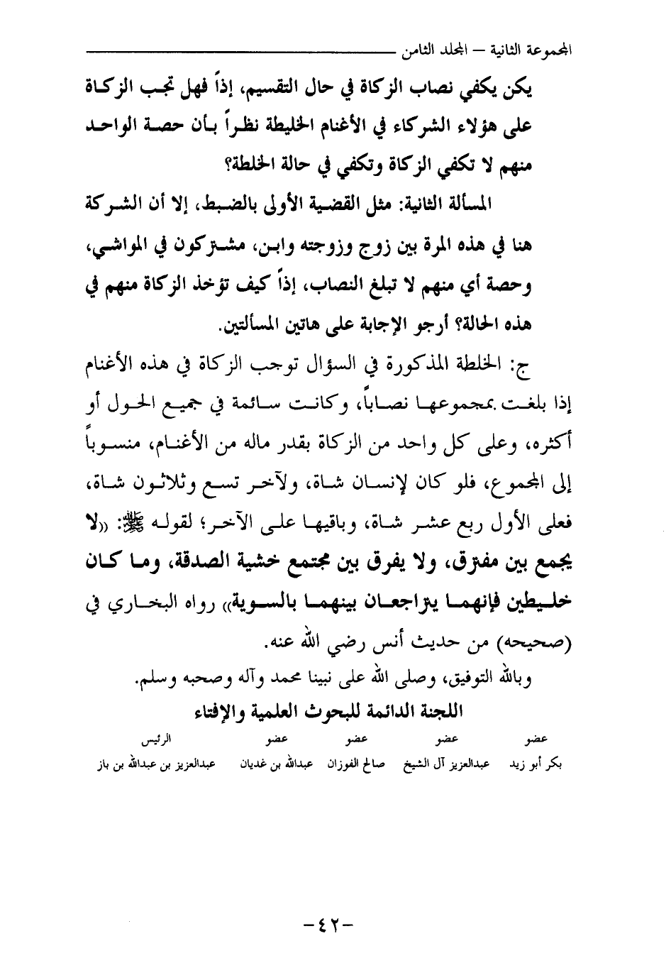 ج: الخلطة المذكورة في السؤال توجب الزكاة في هذه الأغنام إذا بلغت بمجموعها نصابا، وكانت سائمة في جميع الحول أو أكثره، وعلى كل واحد من الزكاة بقدر ماله من الأغنام، منسوبا إلى المجموع، فلو كان لإنسان شاة، ولآخر تسع وثلاثون شاة، فعلى الأول ربع عشر شاة، وباقيها على الآخر؛ لقوله صلى الله عليه وسلم: «لا يجمع بين مفترق، ولا يفرق بين مجتمع خشية الصدقة، وما كان خليطين فإنهما يتراجعان بينهما بالسوية (¬1) » رواه البخاري في (صحيحه) من حديث أنس رضي الله عنه.