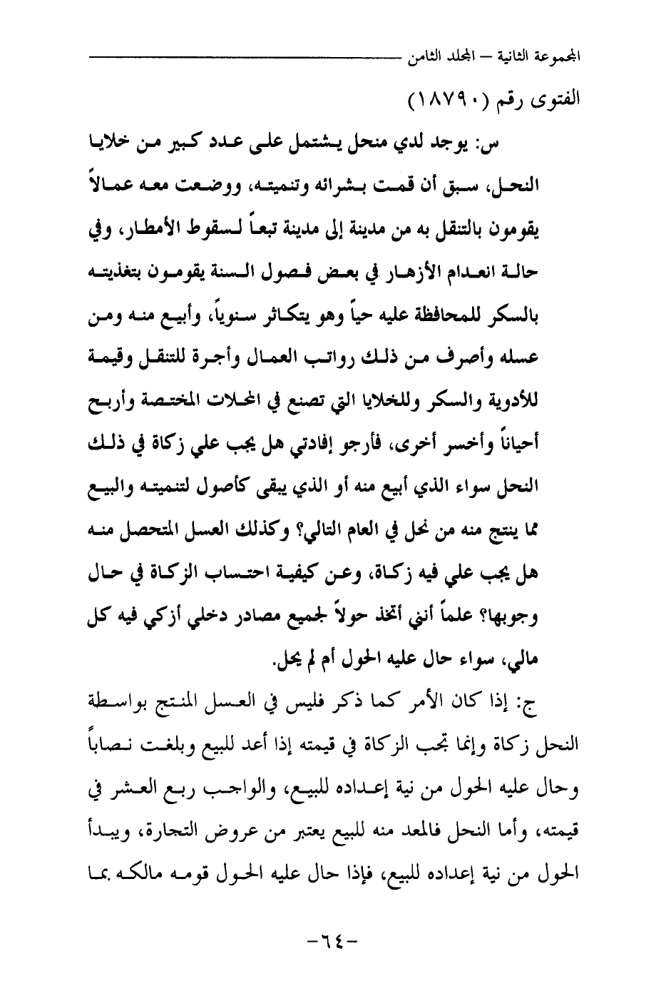 ج: إذا كان الأمر كما ذكر فليس في العسل المنتج بواسطة النحل زكاة وإنما تجب الزكاة في قيمته إذا أعد للبيع وبلغت نصابا وحال عليه الحول من نية إعداده للبيع، والواجب ربع العشر في قيمته، وأما النحل فالمعد منه للبيع يعتبر من عروض التجارة، ويبدأ الحول من نية إعداده للبيع، فإذا حال عليه الحول قومه مالكه بما