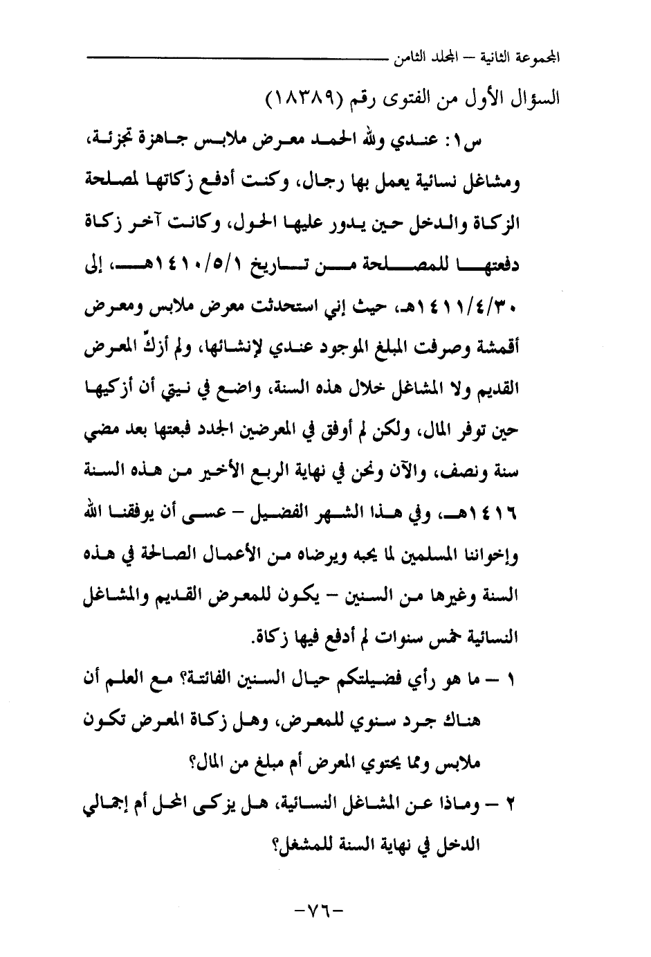 س1: عندي ولله الحمد معرض ملابس جاهزة تجزئة، ومشاغل نسائية يعمل بها رجال، وكنت أدفع زكاتها لمصلحة الزكاة والدخل حين يدور عليها الحول، وكانت آخر زكاة دفعتها للمصلحة من تاريخ 1 / 5 / 1410هـ، إلى 30 / 4 / 1411هـ، حيث إني استحدثت معرض ملابس ومعرض أقمشة وصرفت المبلغ الموجود عندي لإنشائها، ولم أزك المعرض القديم ولا المشاغل خلال هذه السنة، واضع في نيتي أن أزكيها حين توفر المال، ولكن لم أوفق في المعرضين الجديدين فبعتها بعد مضي سنة ونصف، والآن ونحن في نهاية الربع الأخير من هذه السنة 1416هـ، وفي هذا الشهر الفضيل – عسى أن يوفقنا الله وإخواننا المسلمين لما يحبه ويرضاه من الأعمال الصالحة في هذه السنة وغيرها من السنين – يكون للمعرض القديم والمشاغل النسائية خمس سنوات لم أدفع فيها زكاة.