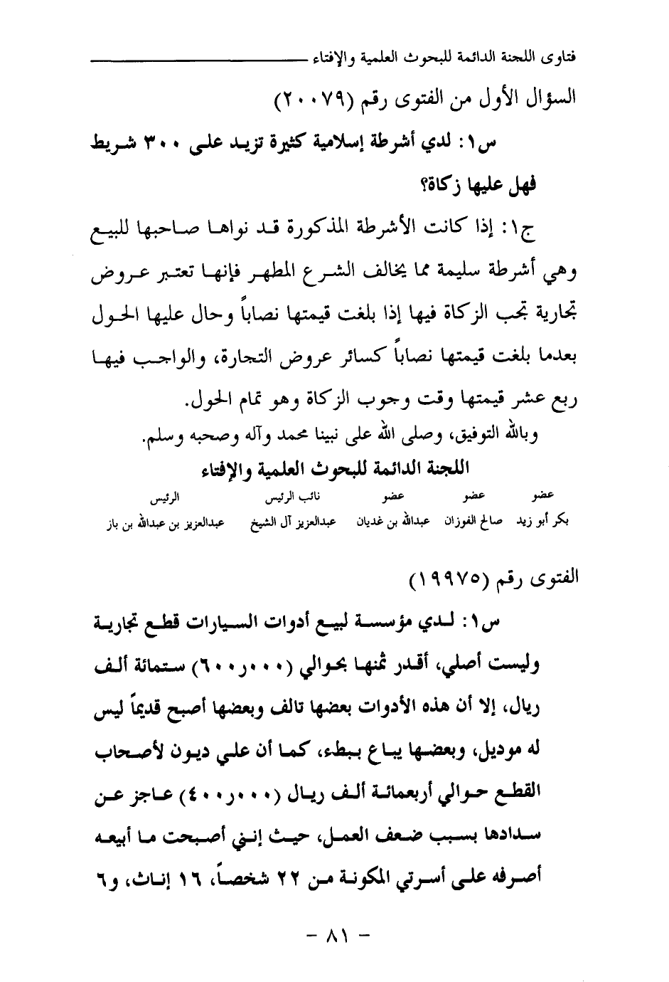 ج1: إذا كانت الأشرطة المذكورة قد نواها صاحبها للبيع وهي أشرطة سليمة مما يخالف الشرع المطهر فإنها تعتبر عروضا تجارية تجب الزكاة فيها إذا بلغت قيمتها نصابا وحال عليها الحول بعدما بلغت قيمتها نصابا كسائر عروض التجارة، والواجب فيها ربع عشر قيمتها وقت وجوب الزكاة وهو تمام الحول.