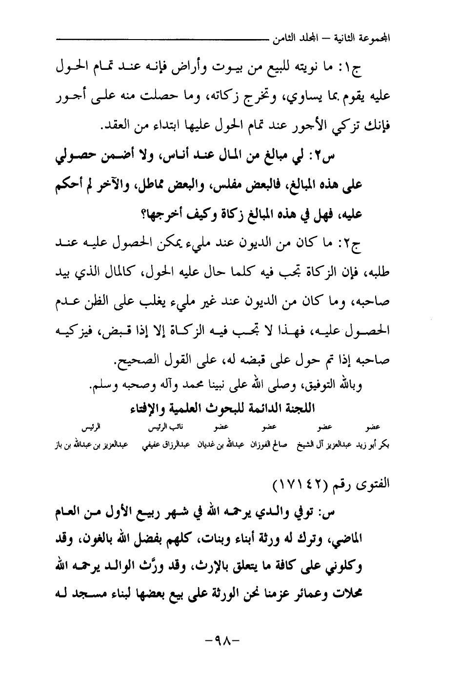 س: توفي والدي يرحمه الله في شهر ربيع الأول من العام الماضي، وترك له ورثة أبناء وبنات، كلهم بفضل الله بالغون، وقد وكلوني على كافة ما يتعلق بالإرث، وقد ورث الوالد يرحمه الله محلات وعمائر عزمنا نحن الورثة على بيع بعضها لبناء مسجد له