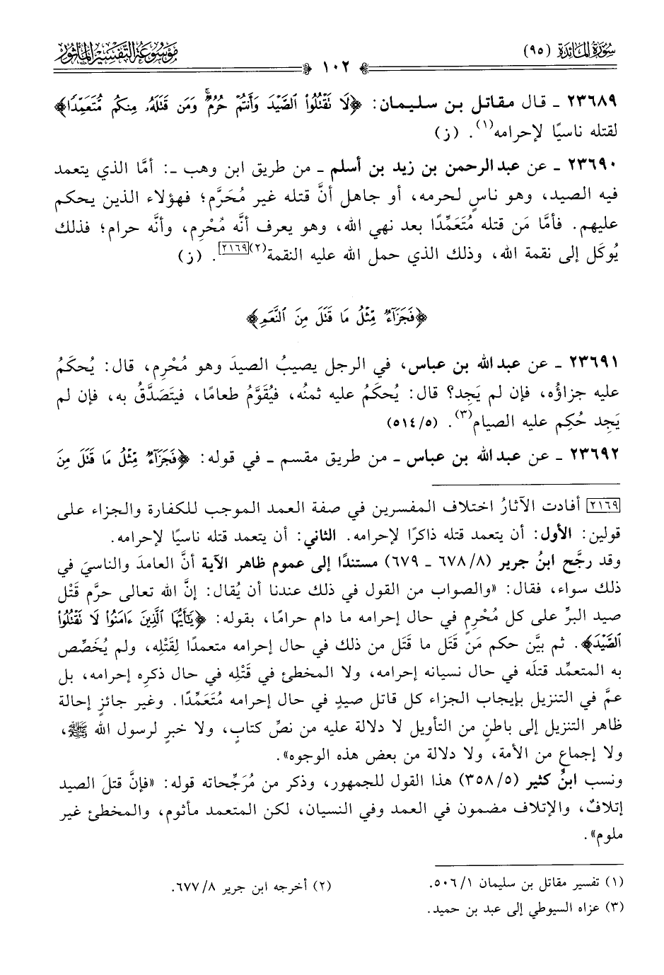 ٢٣٦٨٩ - قال مقاتل بن سليمان: {لا تَقْتُلُوا الصَّيْدَ وأَنْتُمْ حُرُمٌ ومَن قَتَلَهُ مِنكُمْ مُتَعَمِّدًا} لقتله ناسيًا لإحرامه (¬١). (ز)