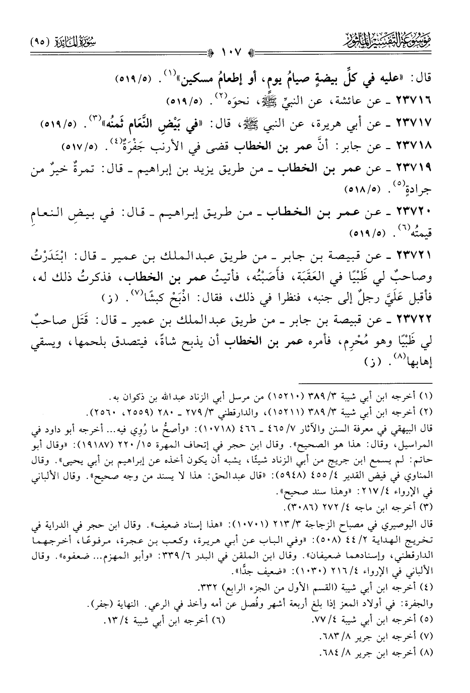 ٢٣٧٢٠ - عن عمر بن الخطاب - من طريق إبراهيم - قال: في بيضِ النعامِ قيمتُه. (¬٦) (٥/ ٥١٩)