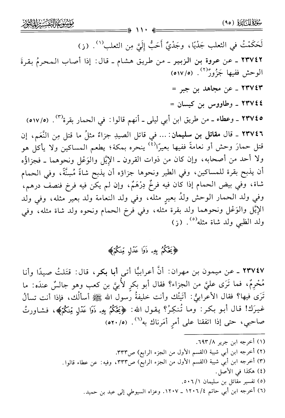 ٢٣٧٤٧ - عن ميمون بن مهران: أنّ أعرابيًّا أتى أبا بكر، قال: قتَلتُ صيدًا وأنا مُحْرِمٌ، فما تَرى عليَّ من الجزاء؟ فقال أبو بكرٍ لأُبيَّ بن كعب وهو جالسٌ عندَه: ما تَرى فيها؟ فقال الأعرابيُّ: أتَيتُك وأنت خليفةُ رسول الله - صلى الله عليه وسلم - أسألُك، فإذا أنت تسألُ غيرَك! قال أبو بكر: وما تُنكِرُ؟ يقول الله: {يحكم به ذوا عدل منكم}، فشاورتُ صاحبي، حتى إذا اتفقنا على أمرٍ أمَرناك به (¬٦). (٥/ ٥٢٠)