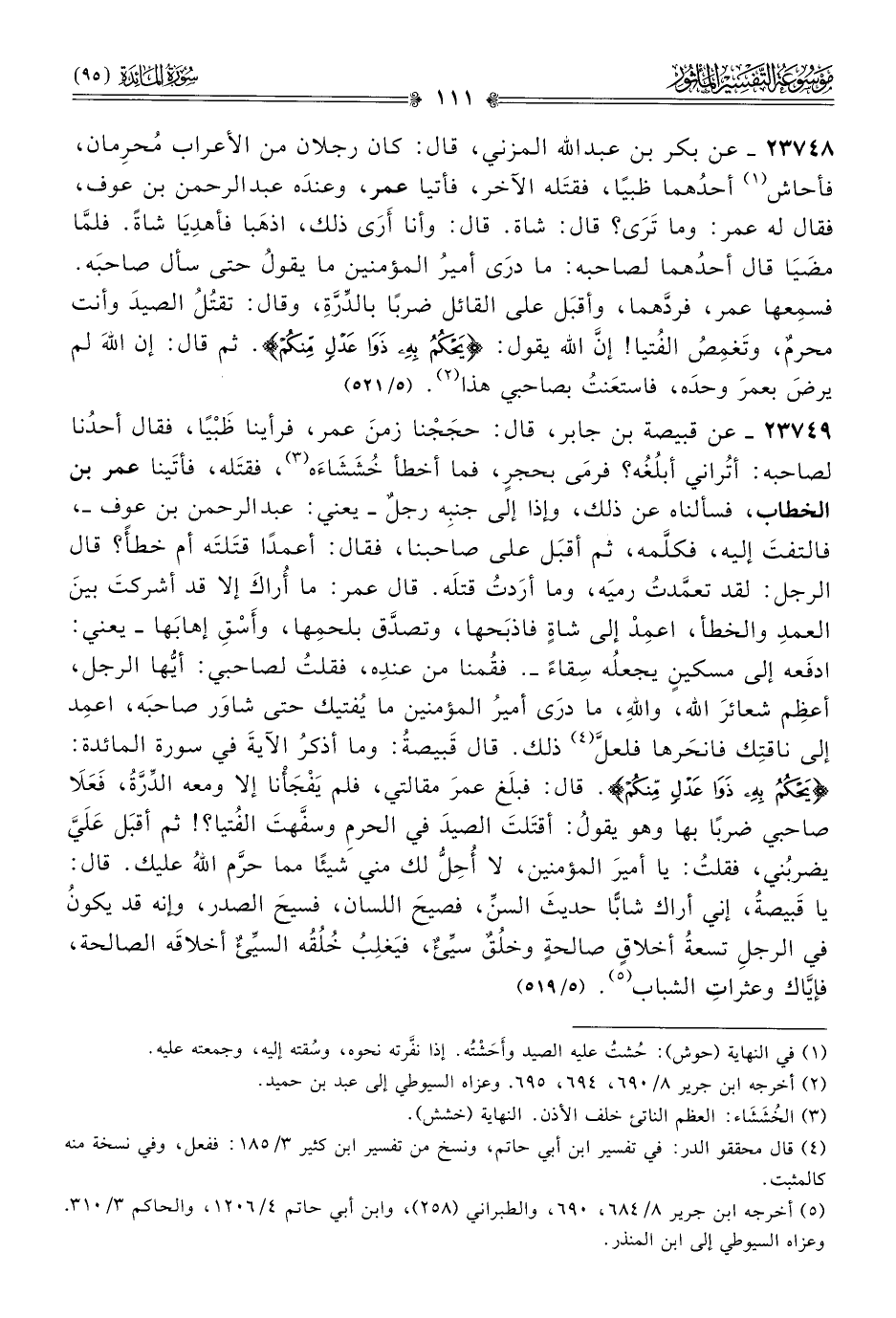 ٢٣٧٤٨ - عن بكر بن عبد الله المزني، قال: كان رجلان من الأعراب مُحرِمان، فأحاش (¬١) أحدُهما ظبيًا، فقتَله الآخر، فأتيا عمر، وعندَه عبد الرحمن بن عوف، فقال له عمر: وما تَرى؟ قال: شاة. قال: وأنا أرى ذلك، اذهَبا فأهدِيا شاةً. فلمّا مضَيا قال أحدُهما لصاحبه: ما درى أميرُ المؤمنين ما يقولُ حتى سأل صاحبَه. فسمِعها عمر، فردَّهما، وأقبَل على القائل ضربًا بالدِّرَّةِ، وقال: تقتُلُ الصيدَ وأنت محرمٌ، وتَغمِصُ الفُتيا! إنّ الله يقول: {يحكم به ذوا عدل منكم}. ثم قال: إن اللهَ لم يرضَ بعمرَ وحدَه، فاستعَنتُ بصاحبي هذا (¬٢). (٥/ ٥٢١)