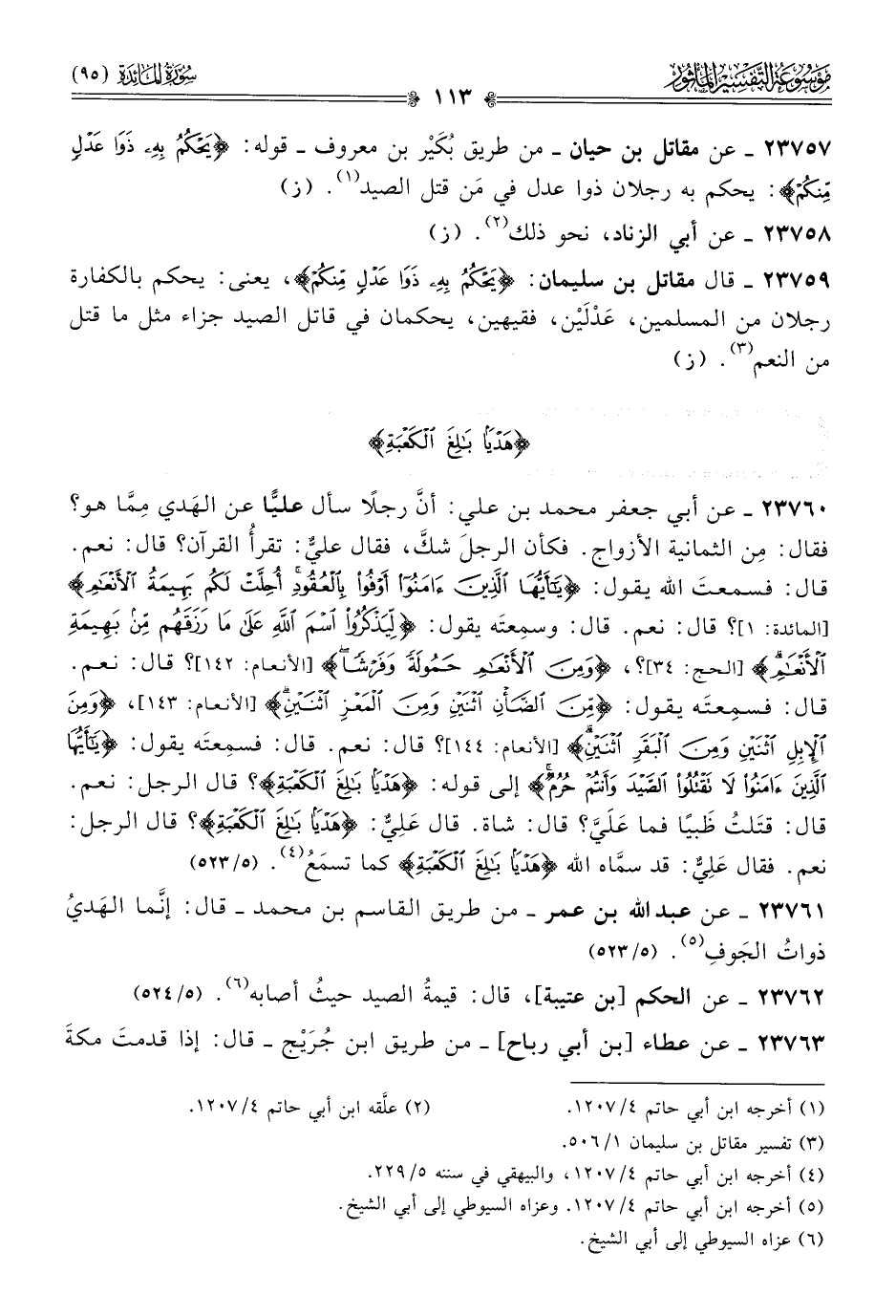 ٢٣٧٦٠ - عن أبي جعفر محمد بن علي: أنّ رجلًا سأل عليًّا عن الهَدي مِمّا هو؟ فقال: مِن الثمانية الأزواج. فكأن الرجلَ شكَّ، فقال عليٌّ: تقرأُ القرآن؟ قال: نعم. قال: فسمعتَ الله يقول: {يا أيها الذين آمنوا أوفوا بالعقود أحلت لكم بهيمة الأنعام} [المائدة: ١]؟ قال: نعم. قال: وسمِعتَه يقول: {ليذكروا اسم الله على ما رزقهم من بهيمة الأنعام} [الحج: ٣٤]؟، {ومن الأنعام حمولة وفرشا} [الأنعام: ١٤٢]؟ قال: نعم. قال: فسمِعتَه يقول: {من الضأن اثنين ومن المعز اثنين} [الأنعام: ١٤٣]، {ومن الإبل اثنين ومن البقر اثنين} [الأنعام: ١٤٤]؟ قال: نعم. قال: فسمِعتَه يقول: {يا أيها الذين آمنوا لا تقتلوا الصيد وأنتم حرم} إلى قوله: {هديا بالغ الكعبة}؟ قال الرجل: نعم. قال: قتَلتُ ظَبيًا فما عَلَيَّ؟ قال: شاة. قال عَلِيٌّ: {هديا بالغ الكعبة}؟ قال الرجل: نعم. فقال عَلِيٌّ: قد سمّاه الله {هديا بالغ الكعبة} كما تسمَعُ (¬٤). (٥/ ٥٢٣)