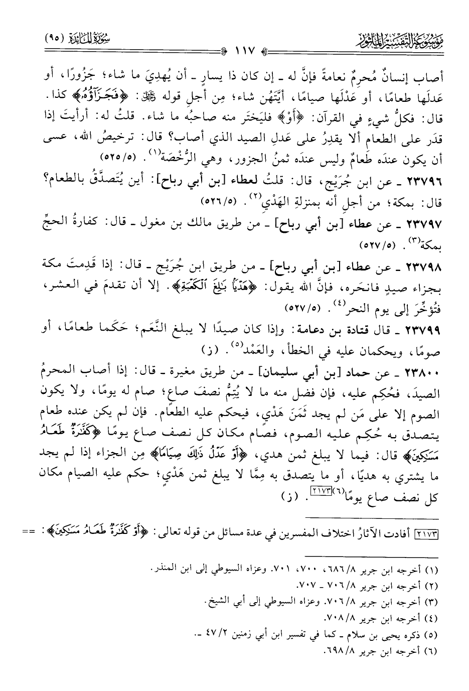 ثم رجَّح (٨/ ٧٠٥) القولَ الأولَ مستندًا إلى ظاهر لفظ الآية، فقال: «والصواب من القول في ذلك عندنا: أنّ قاتل الصيد إذا جزاه بِمِثْلِه من النَّعَم فإنما يَجْزِيه بنظيره في خَلْقٍ وقَدْرِه في جسمه من أقرب الأشياء به شبهًا من الأنعام، فإذا جزاه بالإطعام قوَّمه قيمته بموضعه الذي أصابه فيه؛ لأنه هنالك وجب عليه التكفير بالإطعام، ثم إن شاء أطعم بالموضع الذي أصابه فيه، وإن شاء بمكة، وإن شاء بغير ذلك من المواضع حيث شاء؛ لأن الله تعالى إنما شرط بلوغ الكعبة بالهدي في قتل الصيد دون غيره من جزائه، فللجازي بغير الهدي أن يَجْزيَه بالإطعام والصوم حيث شاء من الأرض». ثم ذكر قولًا ثالثًا في المسألة، وهو: لا يُجْزِئ الهَدْيُ والإطعام إلا بمكة، فأما الصوم فإن كفَّر به يصوم حيث شاء من الأرض. واستشهد له بآثارٍ عن السلف، ثم علَّق عليه، فقال (٨/ ٧٠٧): «فأما الهدي فإنّه مَن جزى به ما قَتَل من الصيد، فلن يَجْزِيَه من كفّارة ما قَتَل من ذلك إلا أن يُبْلِغَه الكعبة طيِّبًا، كما قال -تعالى ذكره-، وينحره أو يذبحه، ويتصدق به على مساكين الحَرَم. وعنى بالكعبة في هذا الموضع: الحَرَم كلَّه. ولمن قَدِم بهَدْيِه الواجب من جزاء الصيد أن ينحره في أيِّ وقت شاء، قبل يوم النحر وبعده، ويُطْعِمَه، وكذلك إن كفَّر بإطعامٍ فله أن يُكفِّر به متى أحبَّ، وحيث أحبَّ، وإن كفَّر بالصوم فكذلك».