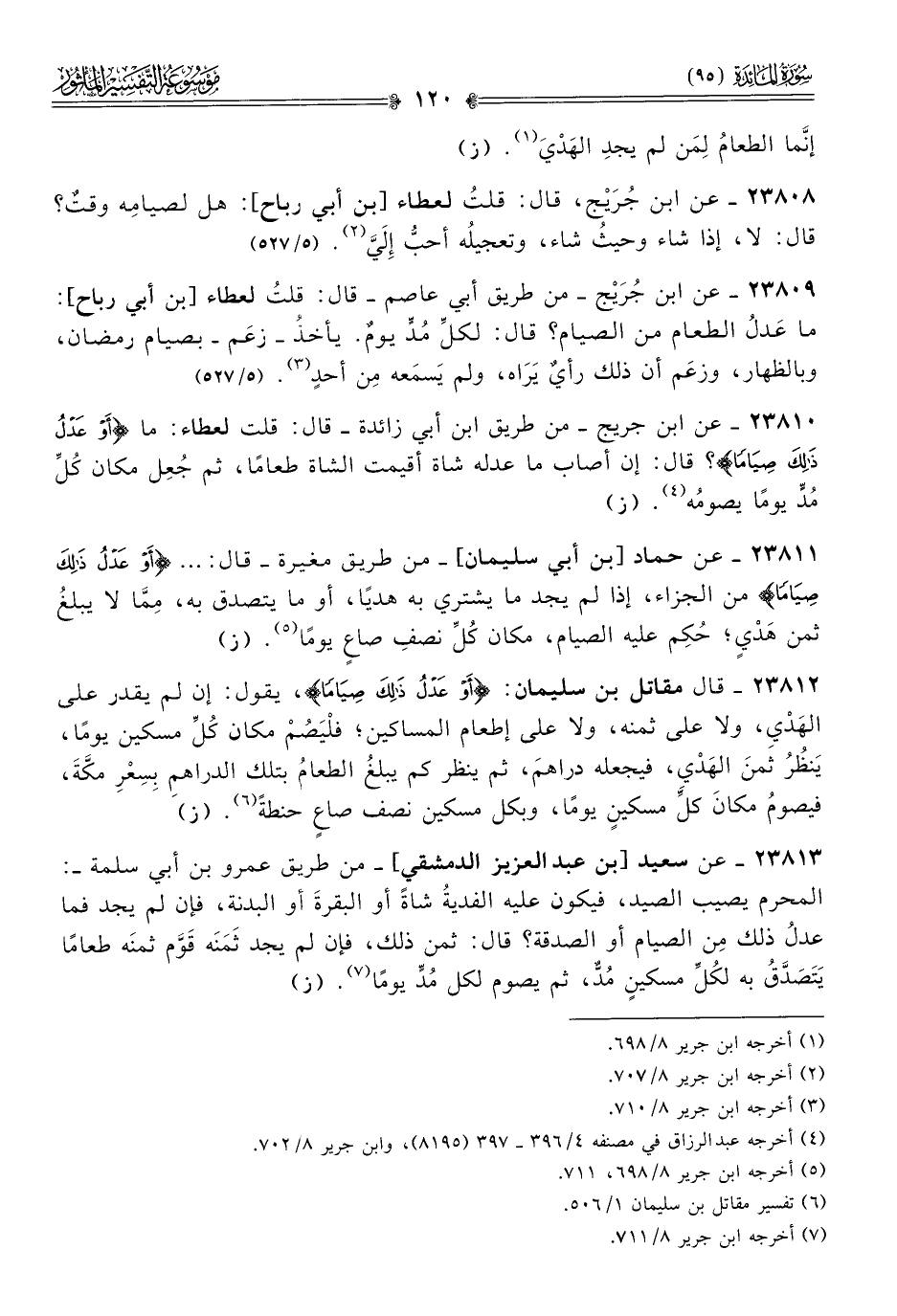 ٢٣٨٠٩ - عن ابن جُرَيْج -من طريق أبي عاصم- قال: قلتُ لعطاء [بن أبى رباح]: ما عَدلُ الطعام من الصيام؟ قال: لكلِّ مُدٍّ يومٌ. يأخذُ -زعَم- بصيام رمضان، وبالظهار، وزعَم أن ذلك رأيٌ يَراه، ولم يَسمَعه مِن أحدٍ (¬٣). (٥/ ٥٢٧)
