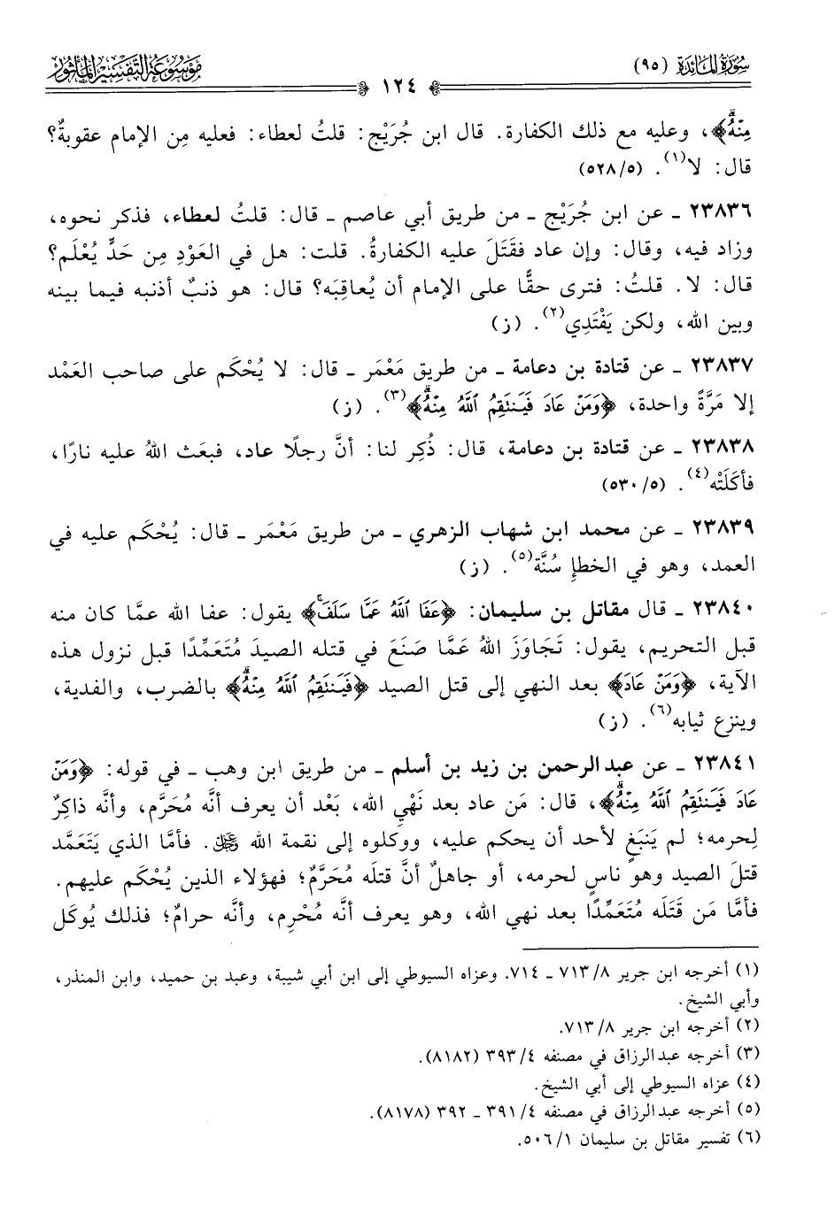 ٢٣٨٤١ - عن عبد الرحمن بن زيد بن أسلم -من طريق ابن وهب- في قوله: {ومن عاد فينتقم الله منه}، قال: مَن عاد بعد نَهْيِ الله، بَعْد أن يعرف أنّه مُحَرَّم، وأنّه ذاكِرٌ لِحرمه؛ لم يَنبَغٍ لأحد أن يحكم عليه، ووكلوه إلى نقمة الله - عز وجل -. فأمّا الذي يَتَعَمَّد قتلَ الصيد وهو ناسٍ لحرمه، أو جاهلٌ أنّ قتلَه مُحَرَّمٌ؛ فهؤلاء الذين يُحْكَم عليهم. فأمّا مَن قَتَلَه مُتَعَمِّدًا بعد نهي الله، وهو يعرف أنّه مُحْرِم، وأنّه حرامٌ؛ فذلك يُوكَل