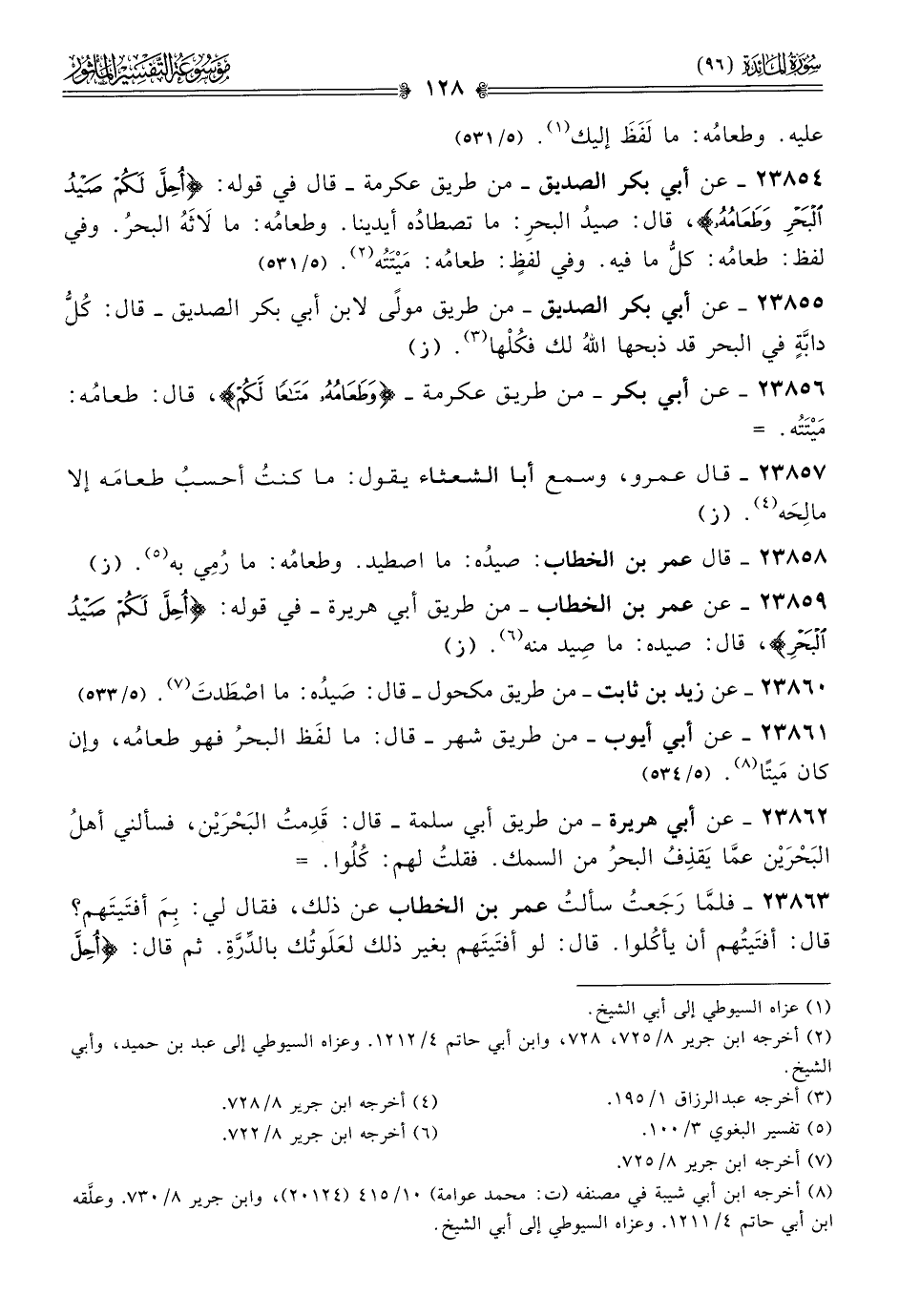 ٢٣٨٥٨ - قال عمر بن الخطاب: صيدُه: ما اصطيد. وطعامُه: ما رُمِي به (¬٥). (ز)