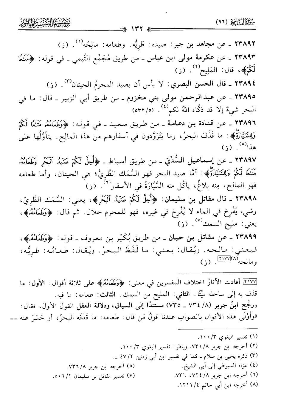 ٢٣٨٩٨ - قال مقاتل بن سليمان: {أُحِلَّ لَكُمْ صَيْدُ البَحْرِ}، يعني: السَّمَك الطَّرِيّ، وشيء يُفْرِخ في الماء لا يُفْرِخ في غيره، فهو للمحرم حلال. ثم قال: {وطَعامُهُ}، يعني: مليح السمك (¬٧). (ز)