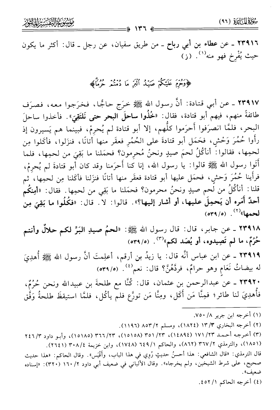٢٣٩١٨ - عن جابر، قال: قال رسول الله - صلى الله عليه وسلم -: «لحمُ صيدِ البَرِّ لكم حلالٌ وأنتم حُرُمٌ، ما لم تَصِيدوه، أو يُصَد لكم» (¬٣). (٥/ ٥٣٩)